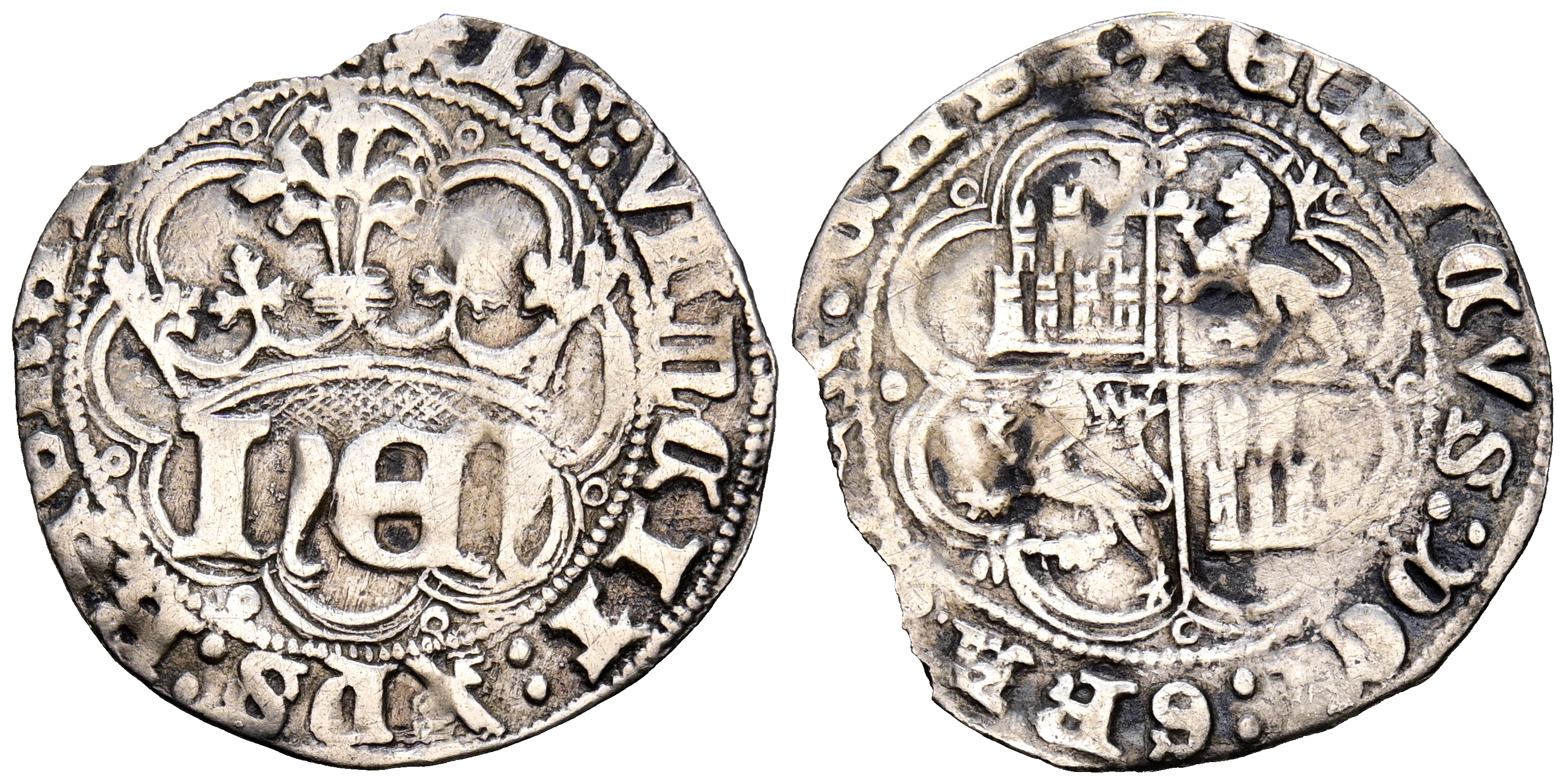 ENRIQUE IV (1454-1474). 1/2 Real. (Ar. 1,50g/21mm). Burgos. (Imperatrix E4:29.2; FAB-719). Anv: Monograma HEN coronado y rodeado con sendos lazos en forma de aspa rematada, todo dentro de gráfila circular, alrededor leyenda: XPS VINCIT XPS REX. Rev: Cuartelado de castillos y leones rampantes a izquierda dentro de gráfila circular, alrededor leyenda: ENRICVS DEI GRACIA REX. MBC-. Rara. Cospel faltado.