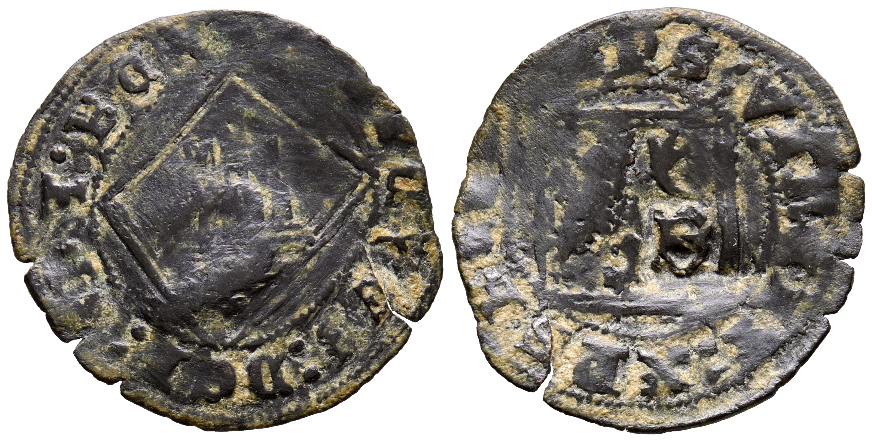 ENRIQUE IV (1454-1474). Blanca de rombo. (Ve. 1,13g/21mm). Contramarca: ¿Murcia? (Imperatrix-CM:C.M). Anv: Castillo dentro de gráfila romboidal, alrededor leyenda: ENRICVS DEI GRACIA. Rev: León rampante y coronado a izquierda con estella bajo las garras, todo dentro de gráfila, alrededor leyenda: XPS VINCIT XPS R. MBC+. Contramarca M gótica en reverso. Muy rara.