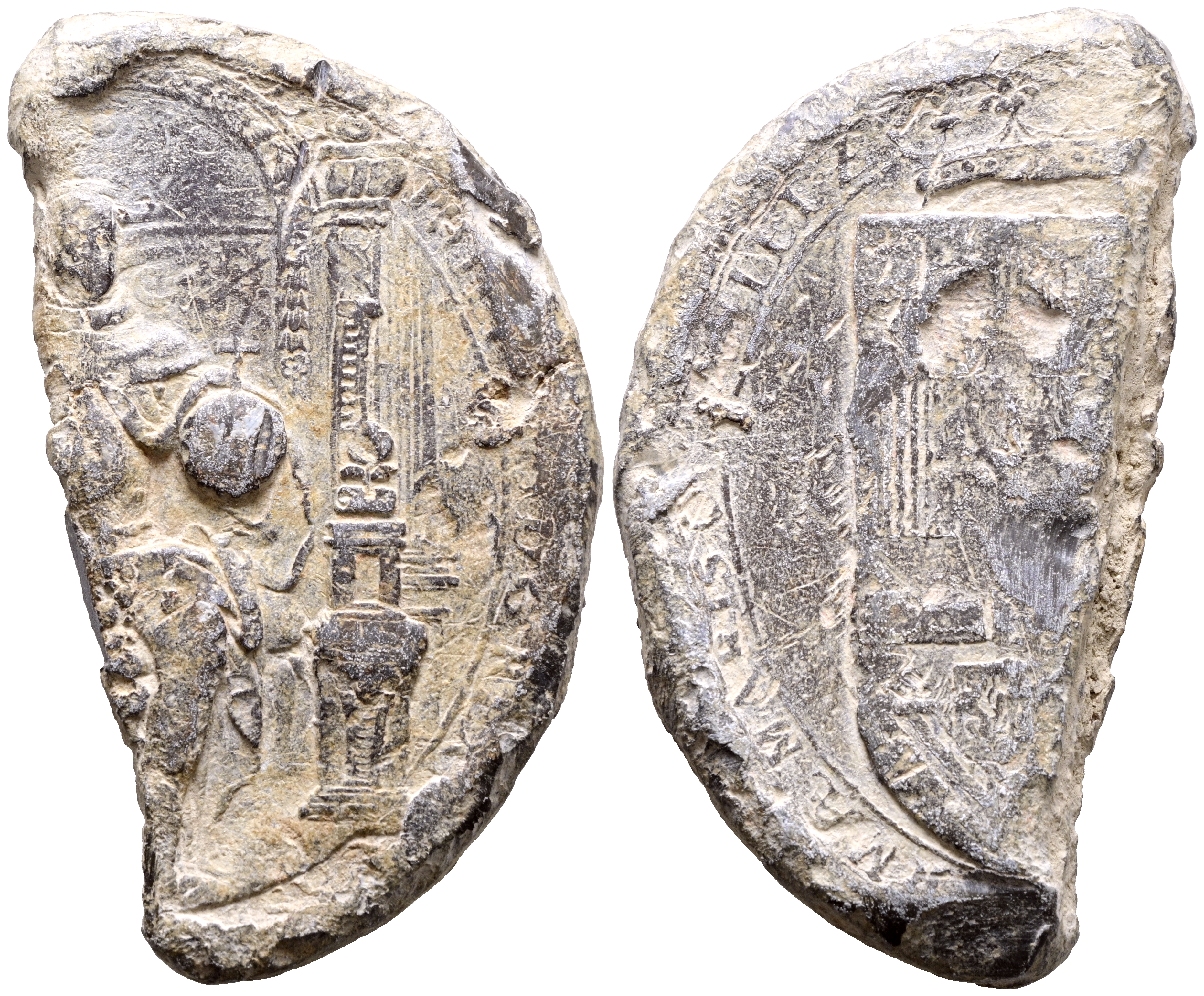 FELIPE II. Sello pendiente. (Pb. 208g/75mm). (Guglieri-636; FN-p. 126). Anv: Felipe II entronizado portando orbe y espada, alrededor leyenda: PHILIPPVS D G REX CASTEL LEG ARAG NAVAR VTR Q SICIL. Rev: Escudo de armas coronado, alrededor leyenda: INDIARVM INSVLARVM ET TERRAE FIRMAE MARIS OCEANI ETC. BC+. Fracción de un 50%.