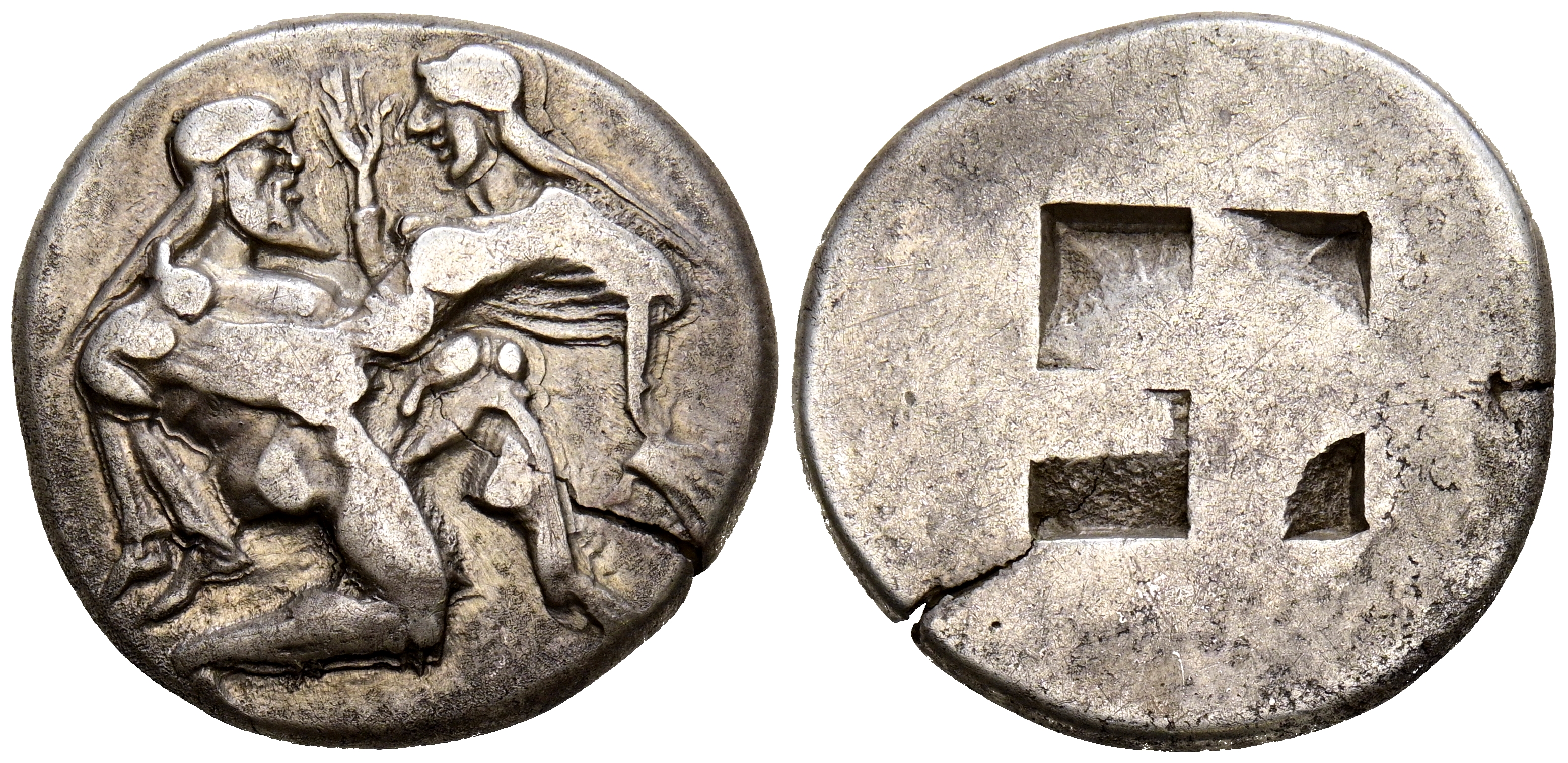 TRACIA, Thasos. Estátera. (Ar. 8,65g/22mm). 480-463 a.C. (SNG Copenhagen 1009; HGC 6, 331). Anv: Sátiro con barba avanzando a derecha de rodillas, cogiendo en brazo a ninfa con las manos alzadas. Rev: Cuatripartito incuso. MBC. Escaso ejemplar