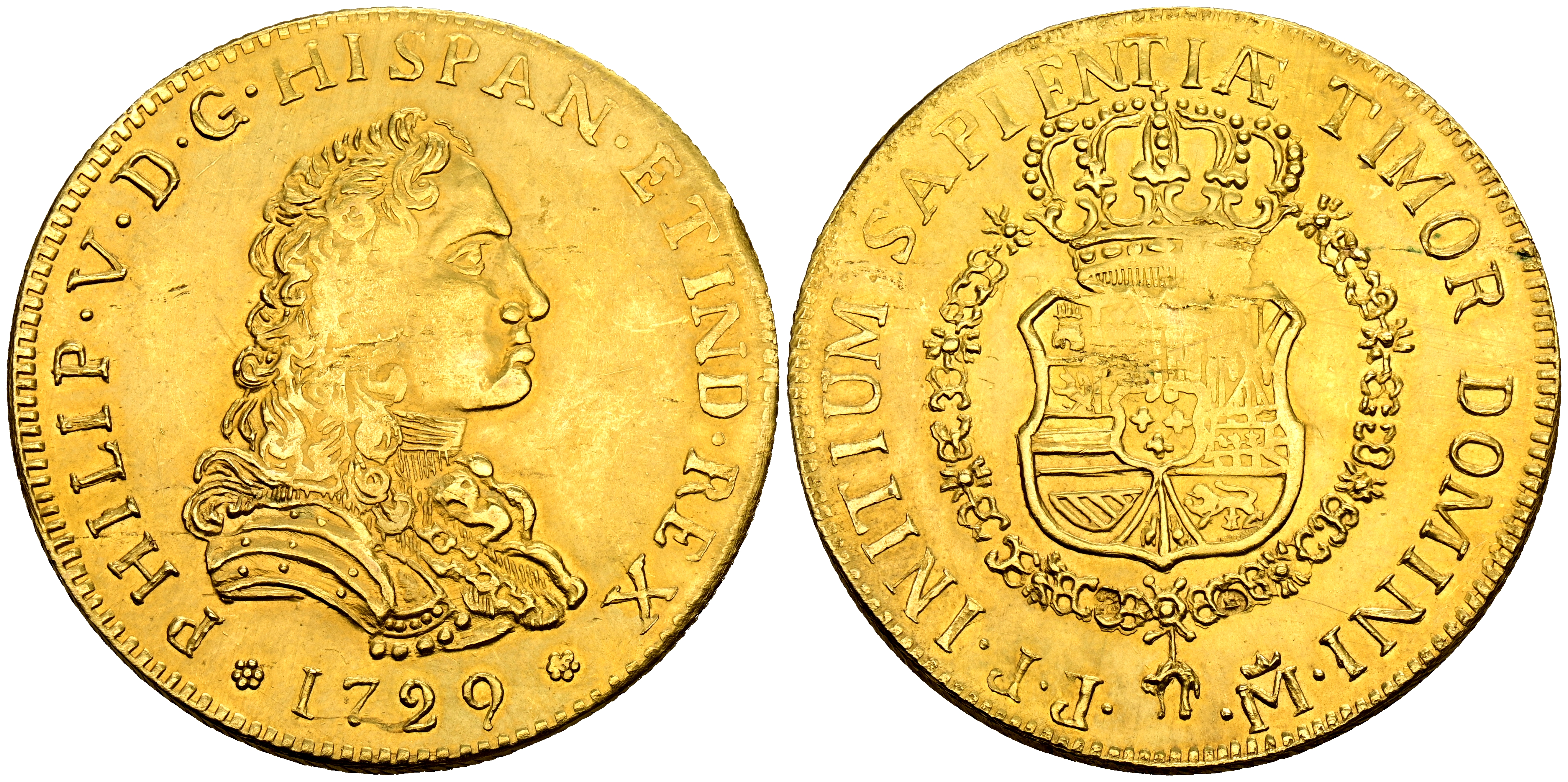 FELIPE V (1746-1759). 8 Escudos. (Au. 25,87g/38mm). 1729. Madrid JJ. Copia de joyería de 0,750 milésimas. EBC.