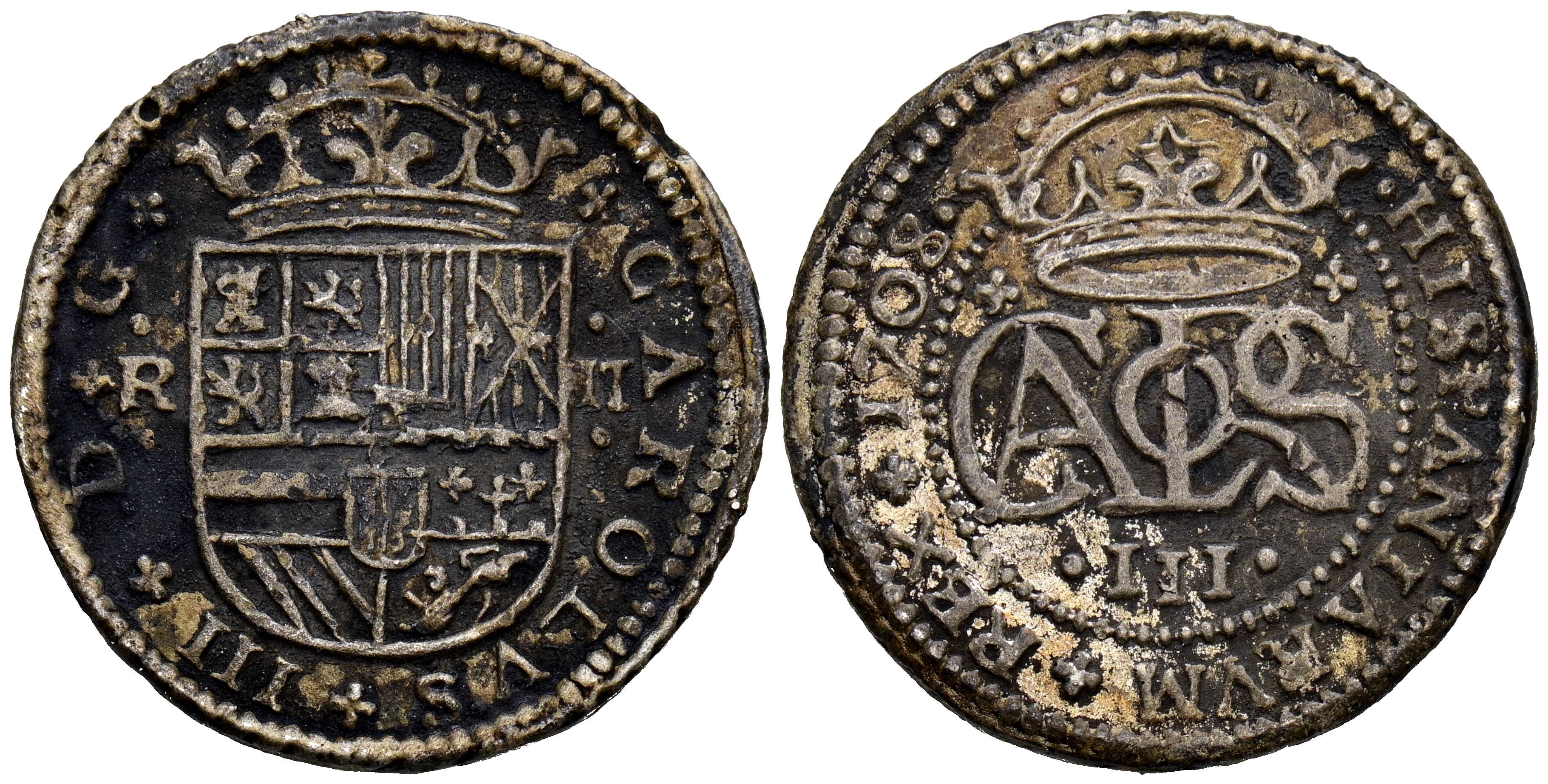 CARLOS III el Pretendiente (1700-1714). 2 Reales. (Ar. 6,09g/26mm). 1708. Barcelona. (Cal-2019-29). MBC-.
