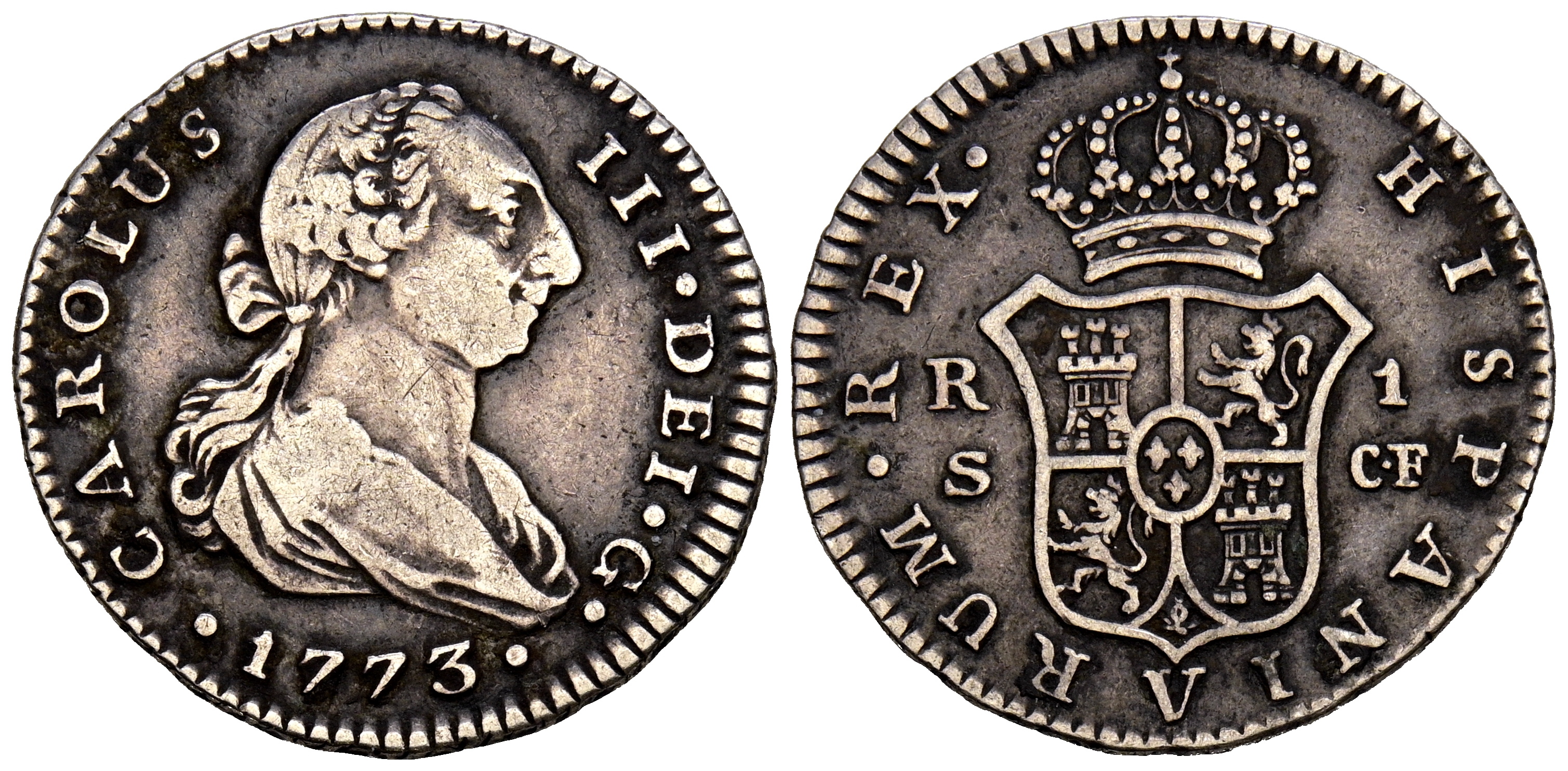 CARLOS III (1759-1788). 1 Real. (Ar. 2,95g/21mm). 1773. Sevilla CF. (Cal-2019-534). MBC. Bonita pátina oscura.