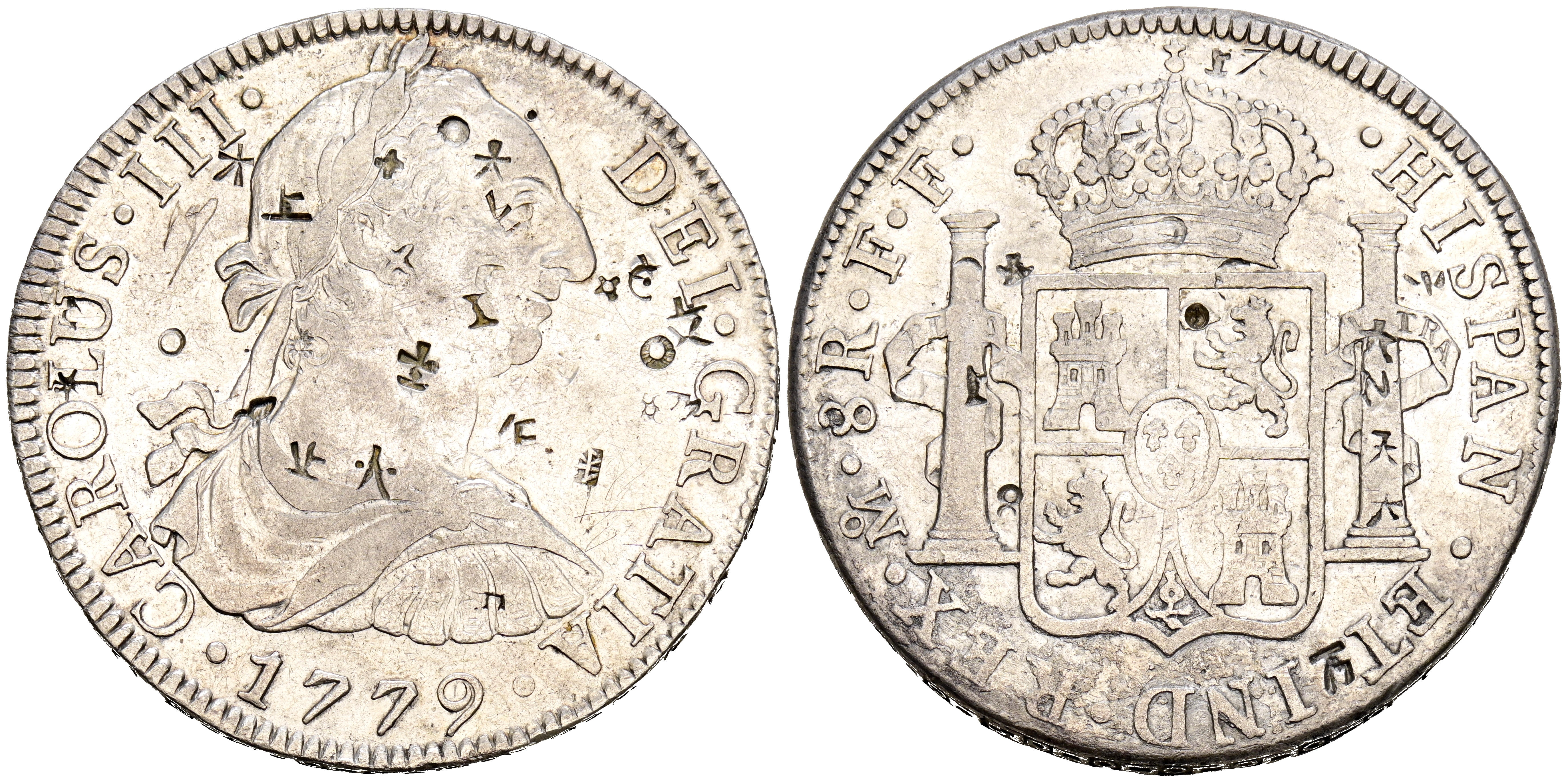 CARLOS III (1759-1788). 8 Reales. (Ar. 26,71g/38mm). 1779. México FF. (Cal-2019-1118). MBC. Resellos orientales.
