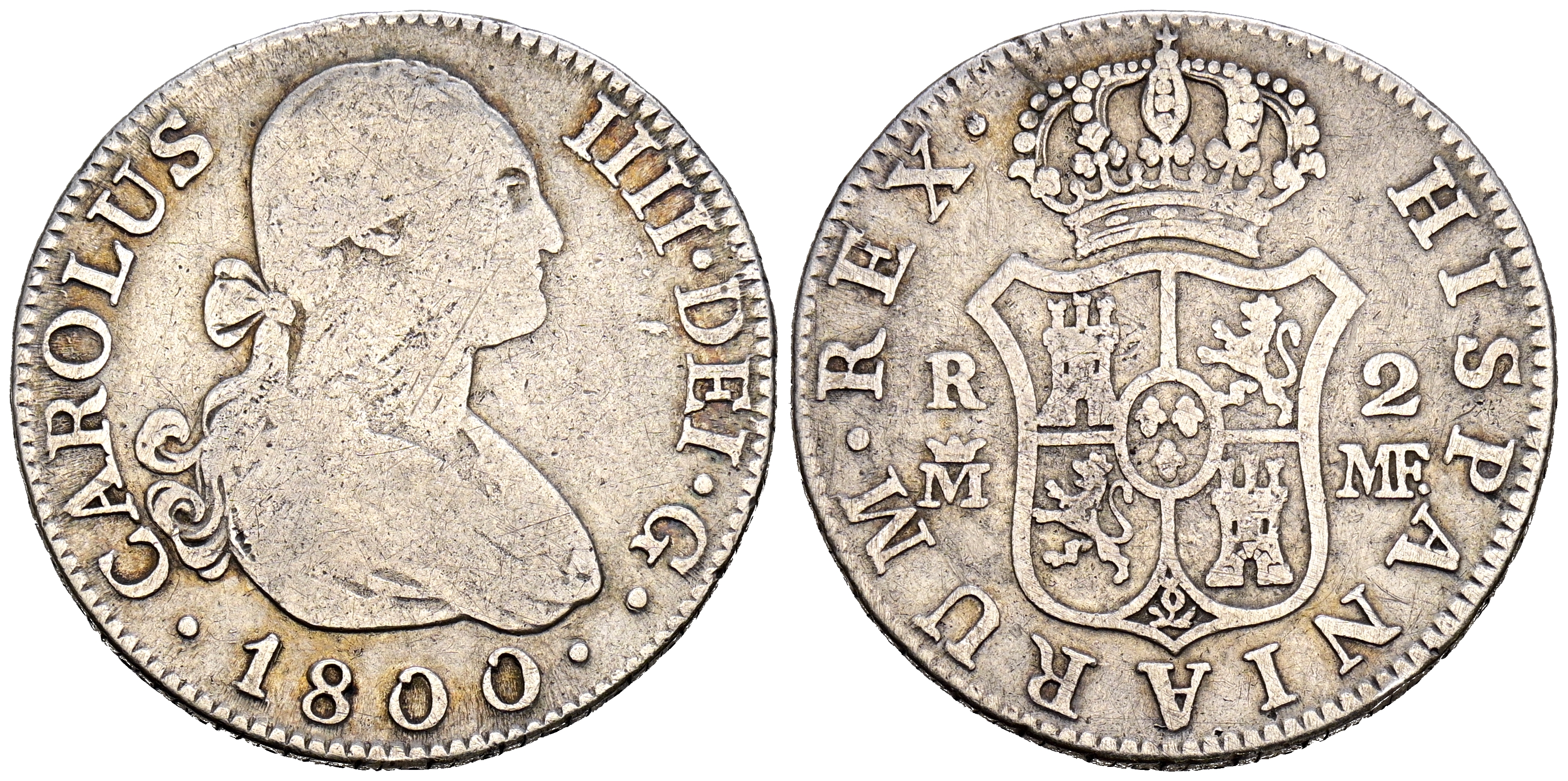 CARLOS IV (1788-1808). 2 Reales. (Ar. 5,59g/26mm). 1800. Madrid MF. (Cal-2019-608). BC+.