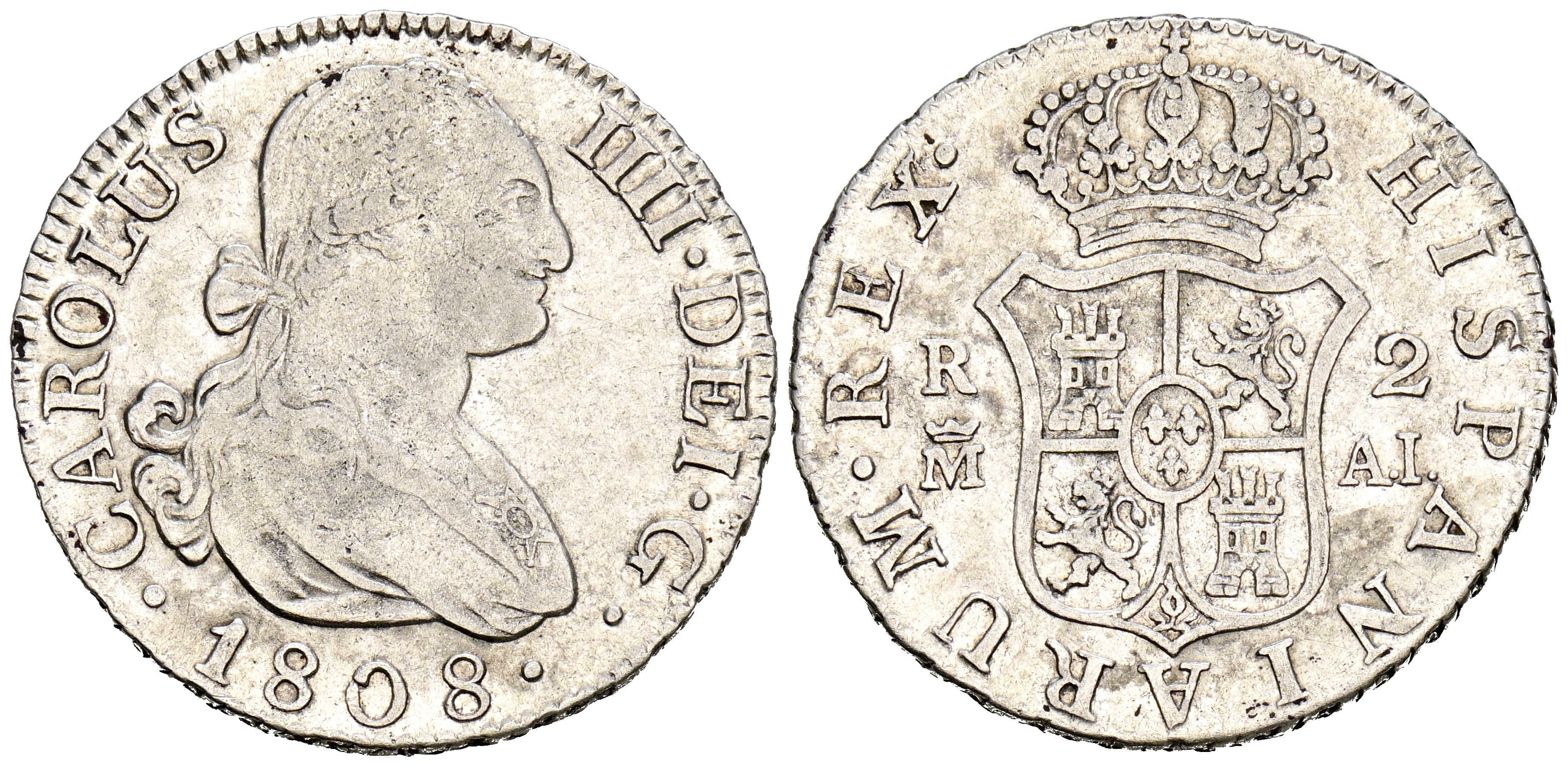 CARLOS IV (1788-1808). 2 Reales. (Ar. 5,80/26mm). 1808. Madrid AI. (Cal-2019-619). MBC+. Ligeros restos de brillo original.