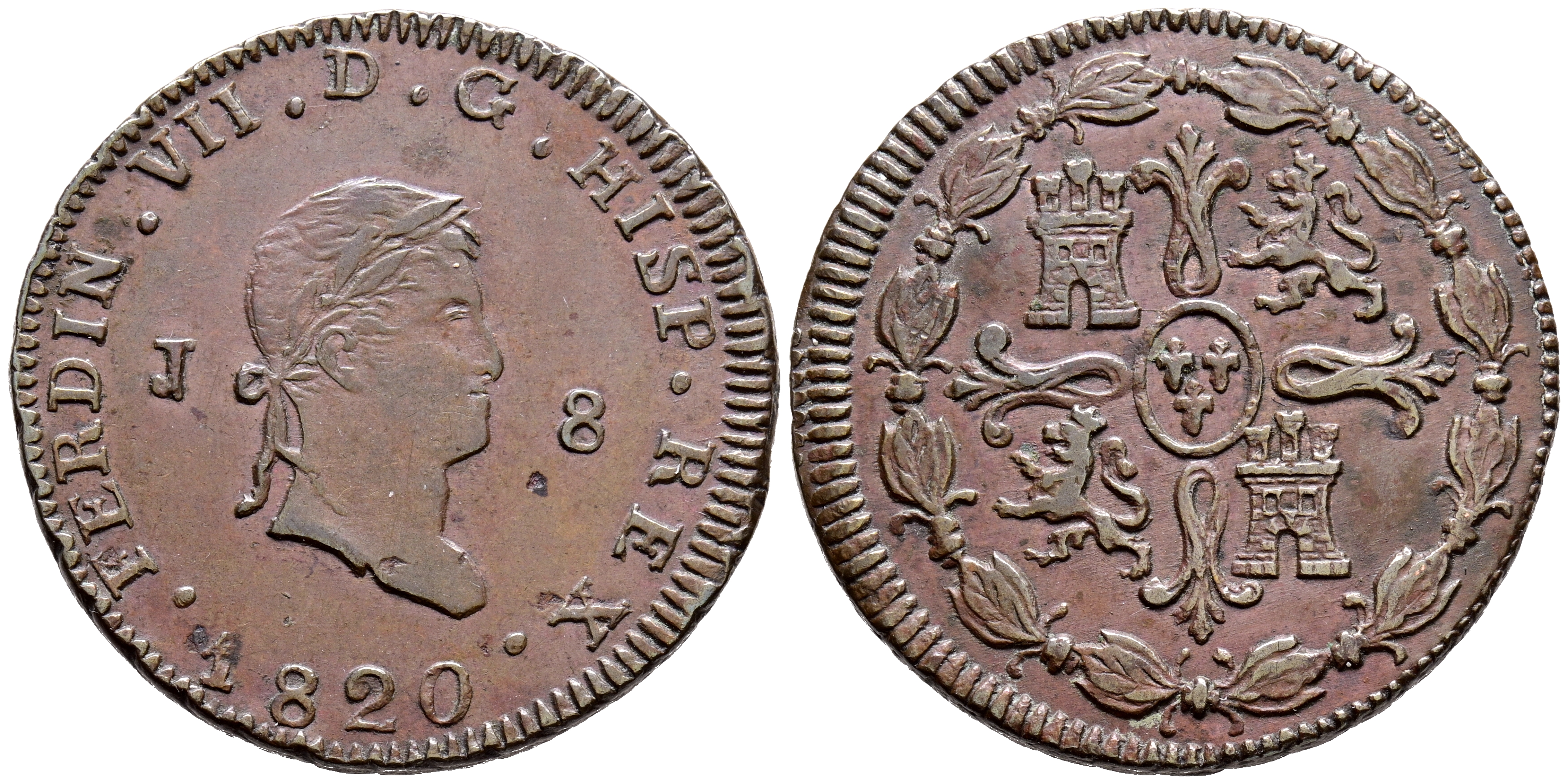 FERNANDO VII (1808-1833). 8 Maravedís. (Ae. 11,00g/31mm). 1820. Jubia. (Cal-2019-200). Busto laureado. MBC/MBC+. Buen ejemplar.