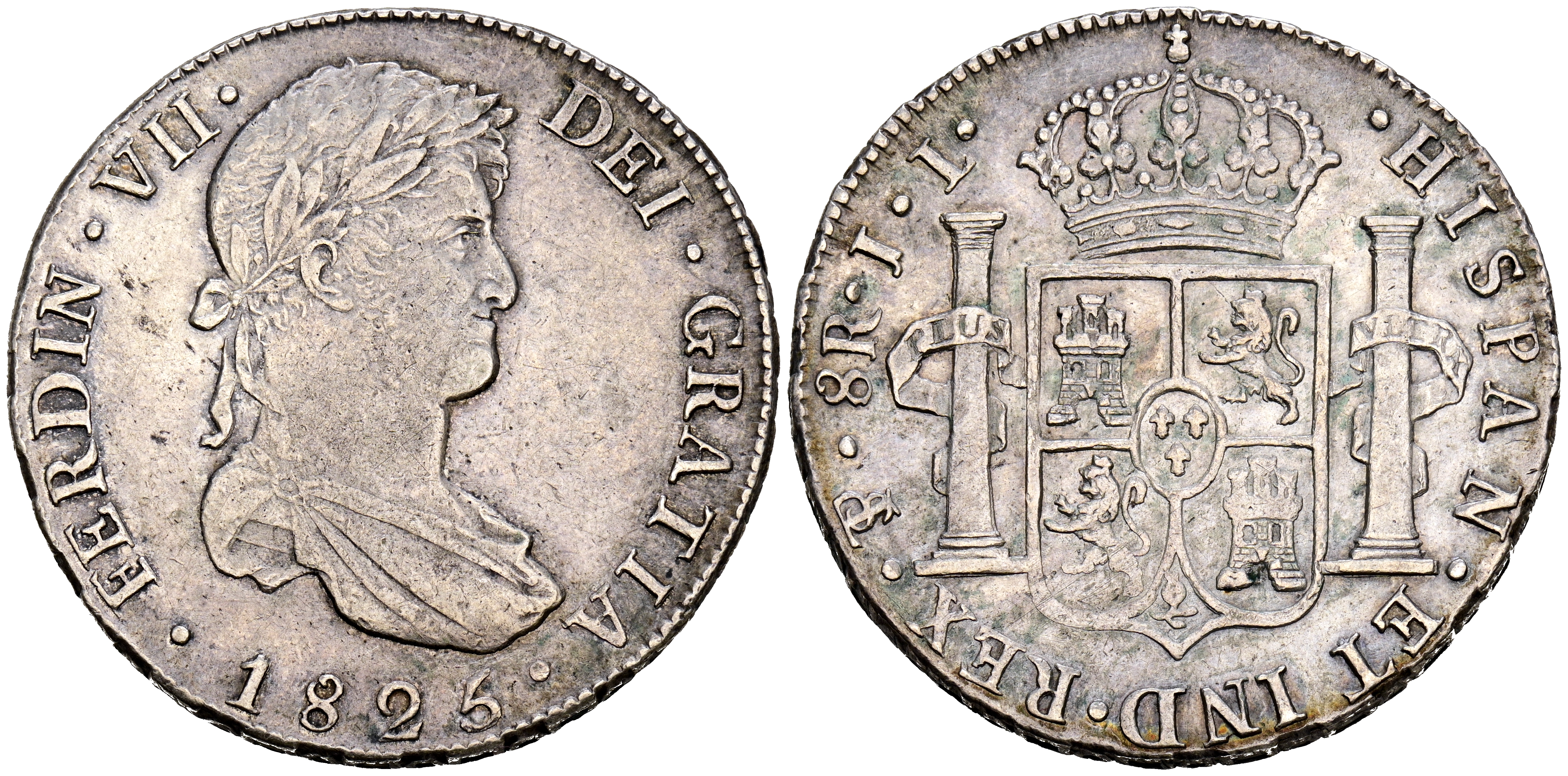 FERNANDO VII (1808-1833). 8 Reales. (Ar. 26,95g/38mm). 1825. Potosí JL. (Cal-2019-1394). Acuñación Republicana. MBC+. Precioso reverso.