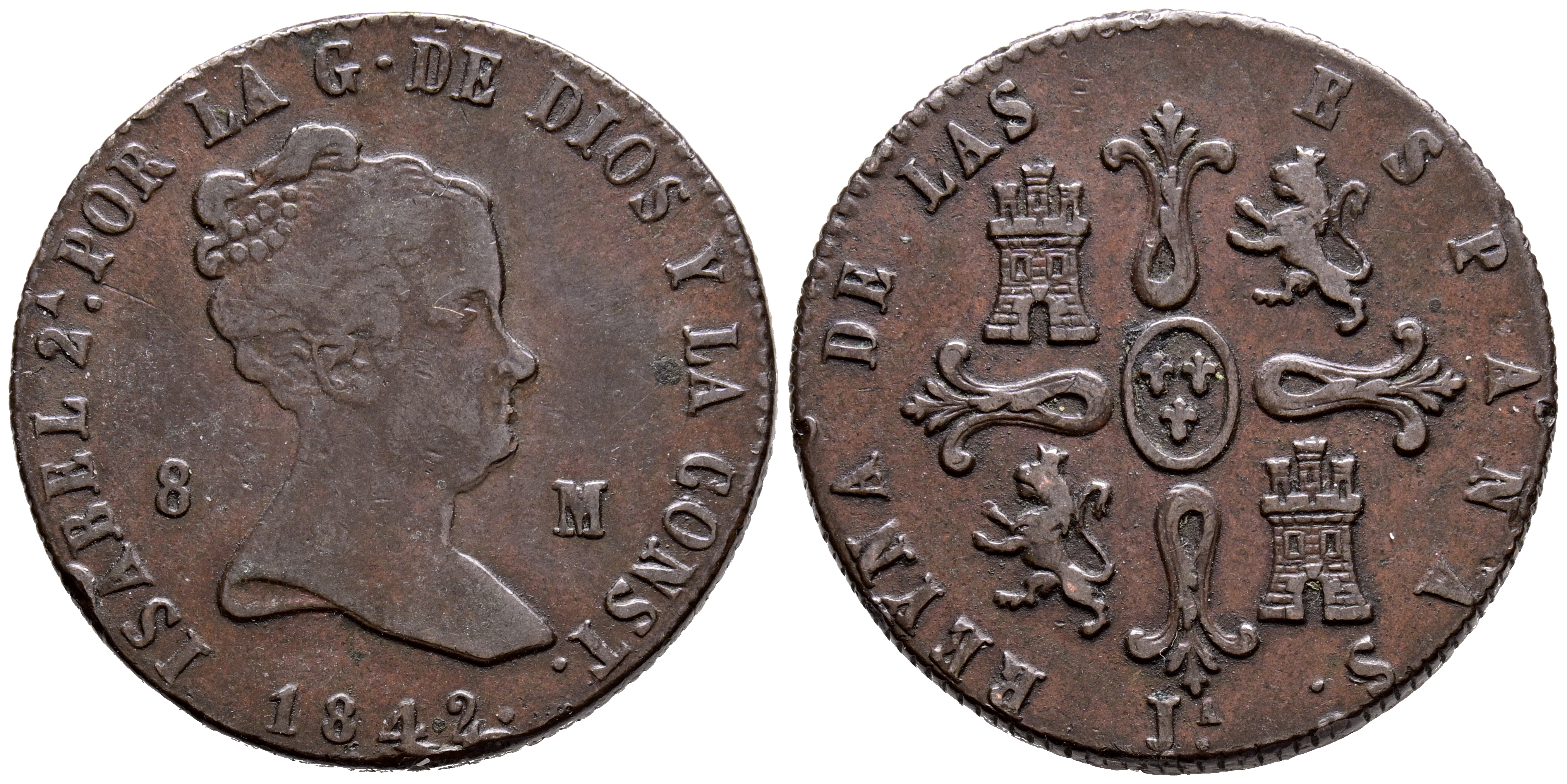 ISABEL II (1833-1868). 8 Maravedís (Ae. 10,53g/28mm). 1842. Jubia. (Cal-2019-109). MBC. Bonito tono.