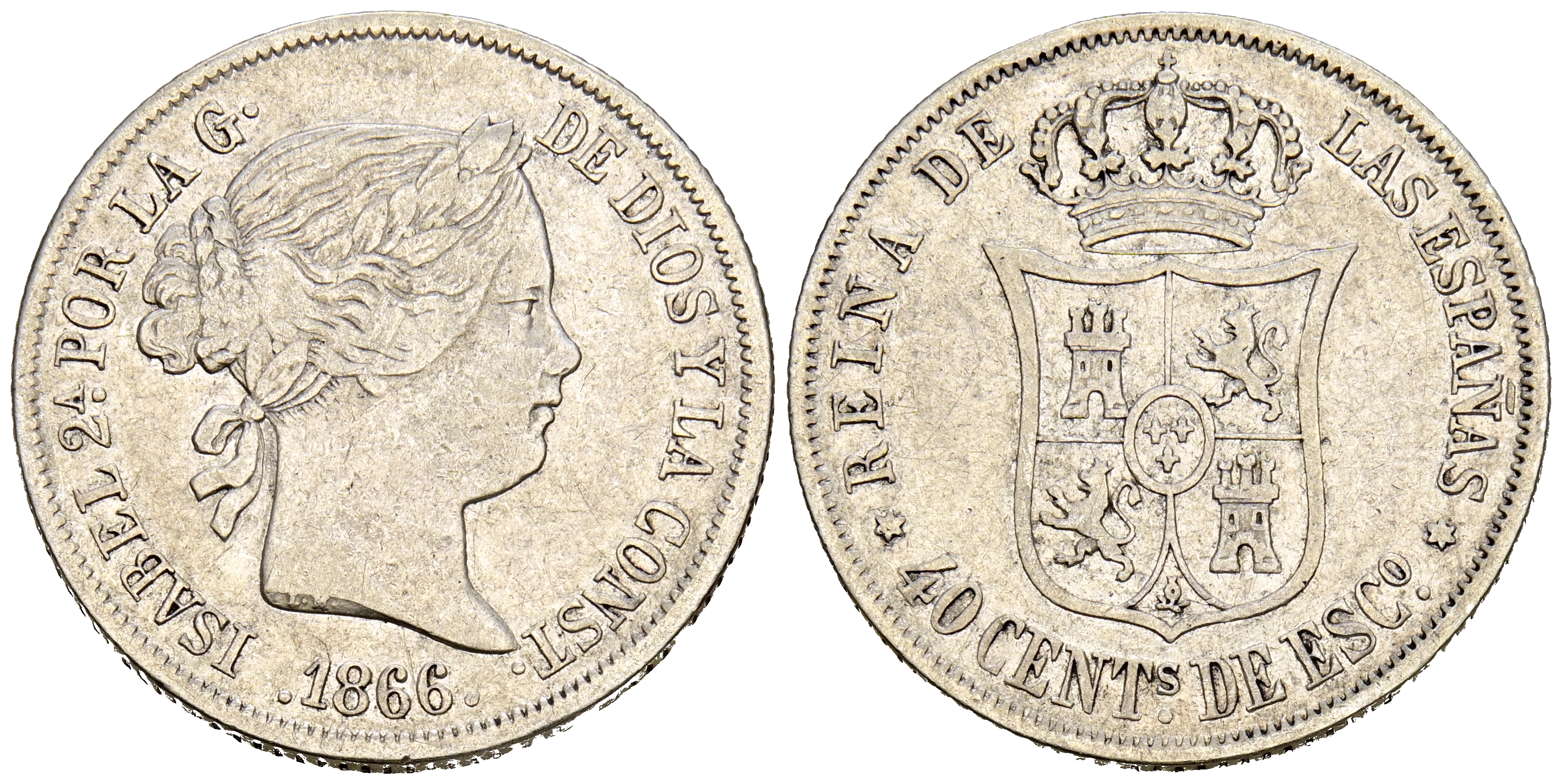 ISABEL II (1833-1868). 40 Céntimos de Escudo. (Ar. 5,17g/23mm). 1866. Madrid. (Cal-2019-501). MBC-.