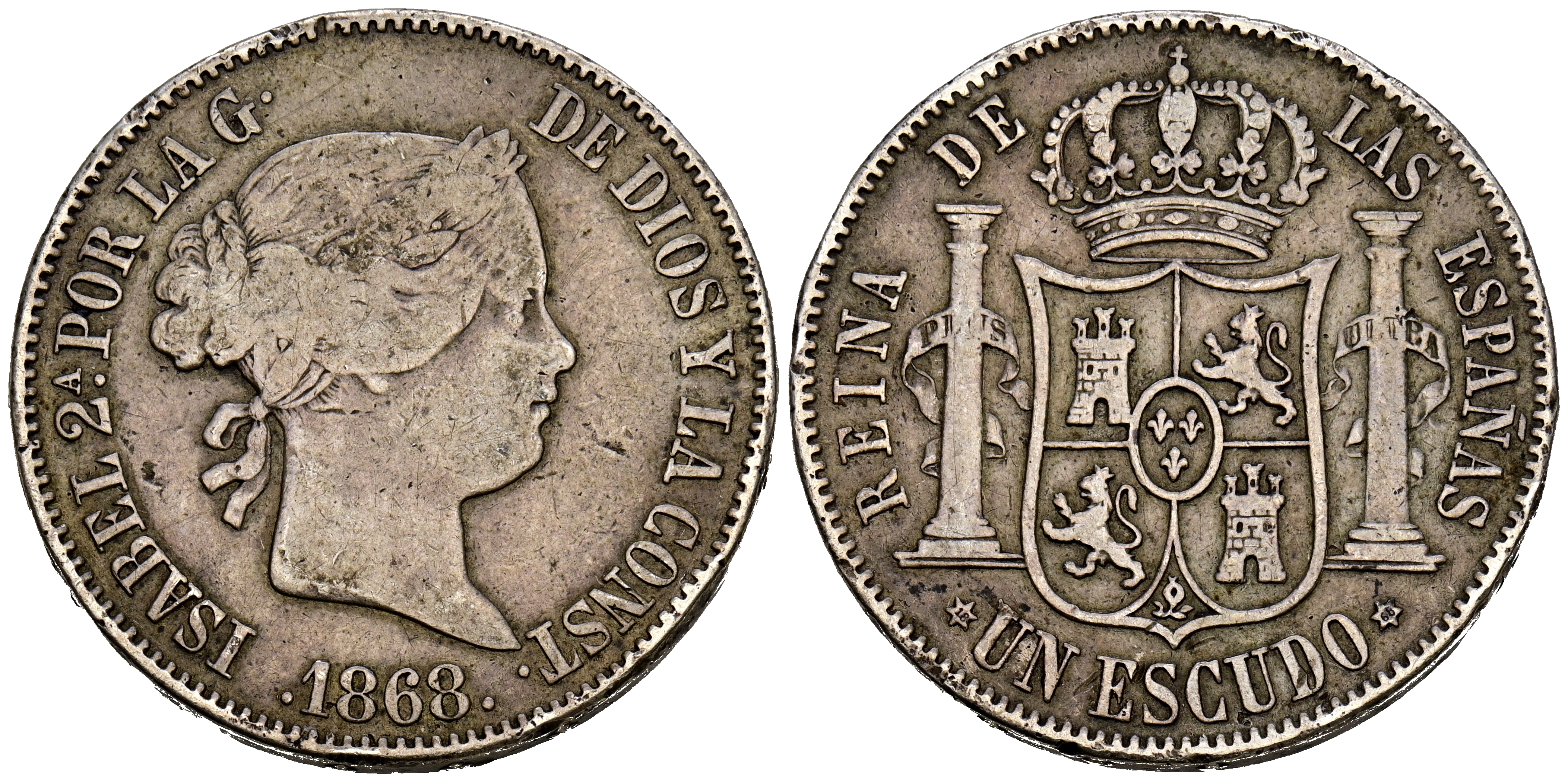 ISABEL II (1833-1868). 1 Escudo. (Ar. 12,77g/29mm). 1868 *18-68. Madrid. (Cal-2019-567). BC+/MBC-.
