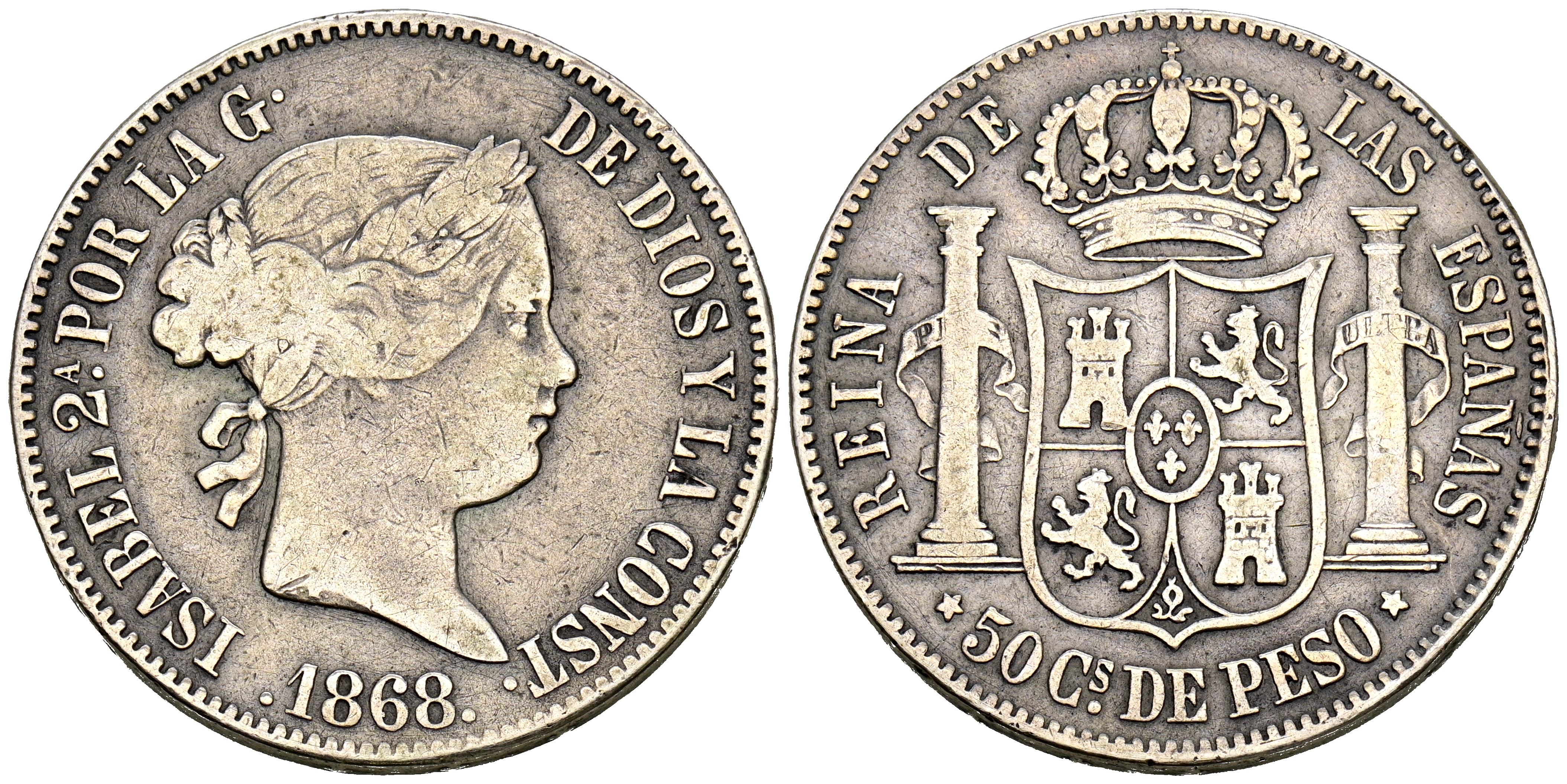 ISABEL II (1833-1868). 50 Centavos de Peso. (Ar. 12,59g/30mm). 1868. Manila. (Cal-2019-667). MBC.