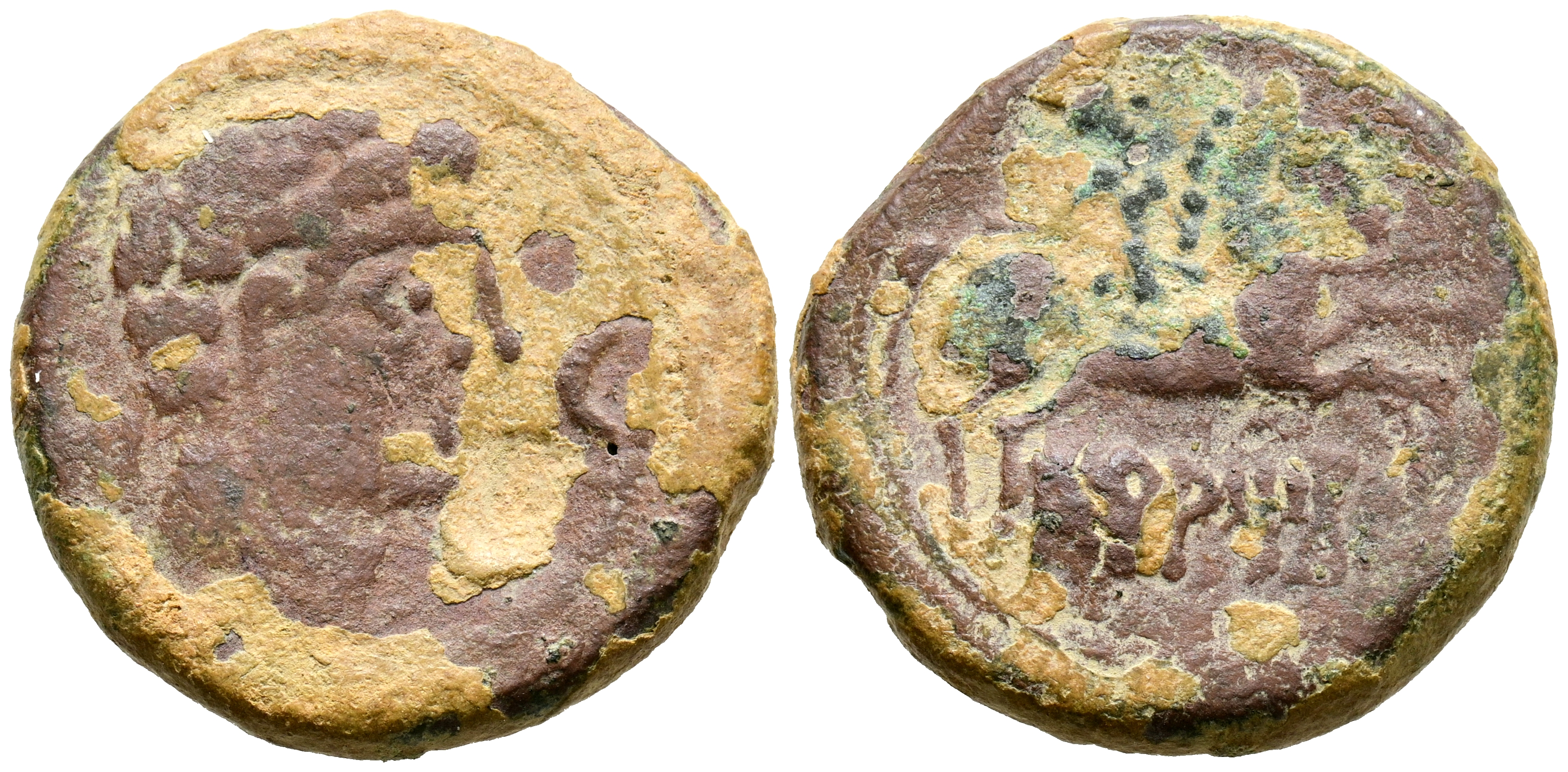 ARATICOS (Arándiga, Zaragoza). As. (Ae. 11,02g/25mm). 120-80 a.C. (FAB-66). Anv: Cabeza masculina a derecha, delante creciente, detrás letra ibérica: A. Rev: Jinete con lanza a derecha, debajo leyenda ibérica: ARATiCoS. MBC-.