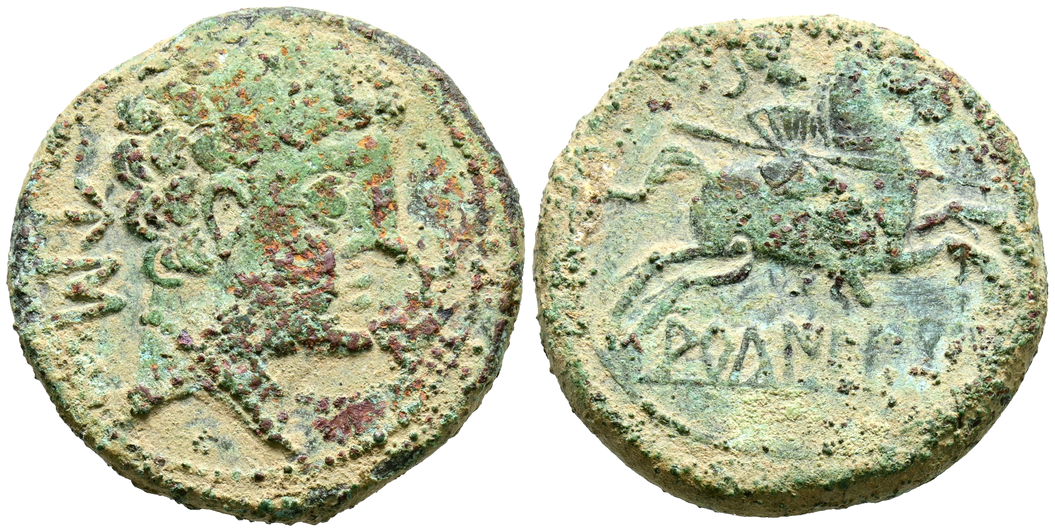 ARCAILICOS (Zona de Soria-Guadalajara). As. (Ae. 11,91g/26mm). 120-80 a.C. (FAB-71). Anv: Cabeza masculina a derecha, delante delfín, detrás letras ibéricas: US. Rev: Jinete con lanza a derecha, debajo leyenda ibérica: ARCaILICoS. MBC-. Oxidaciones limpiadas.