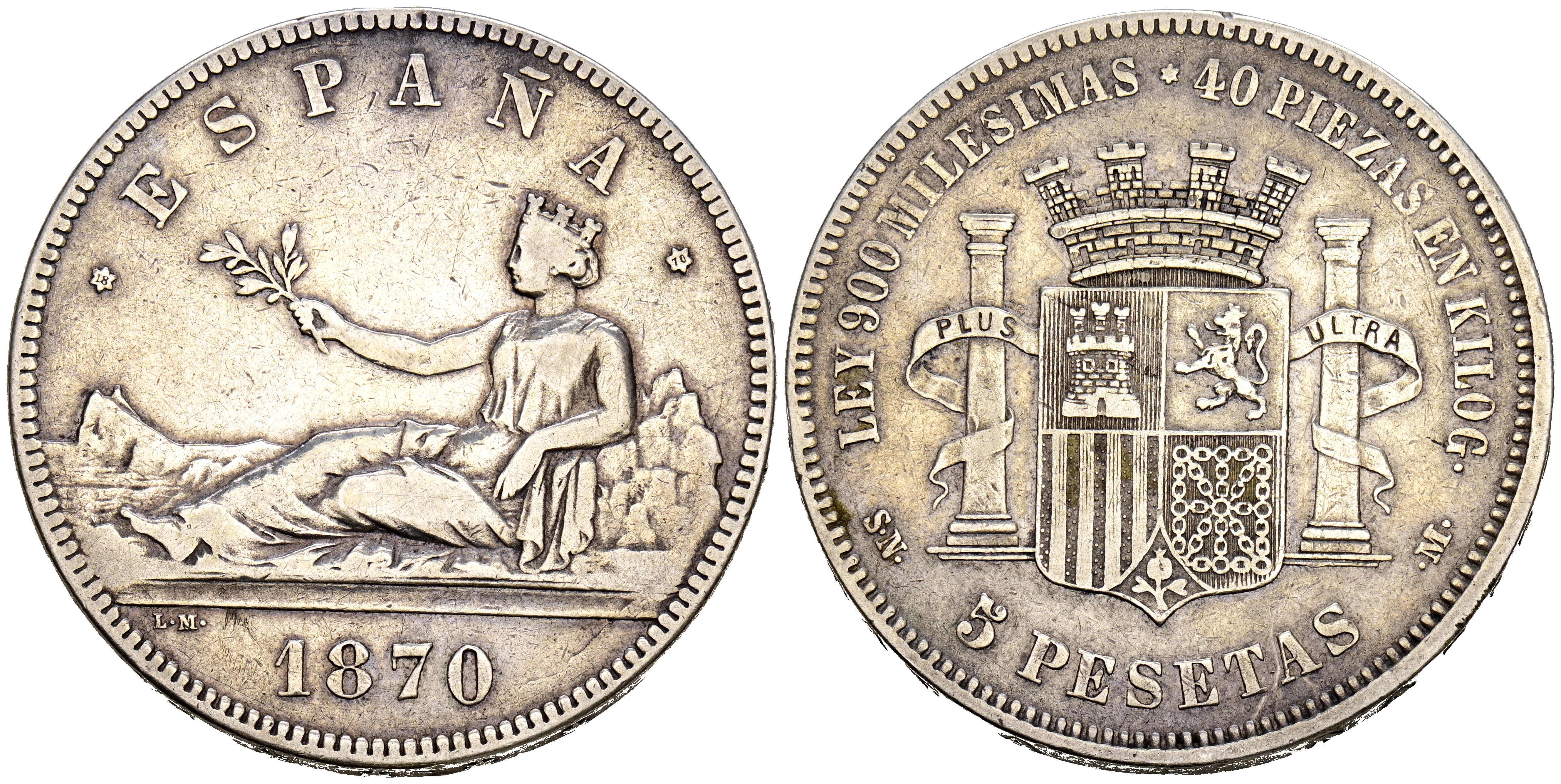 GOBIERNO PROVISIONAL (1868-1871). 5 Pesetas. (Ar. 24,82g/37mm). 1870 *18-70. Madrid SNM. (Cal-2019-39). MBC.