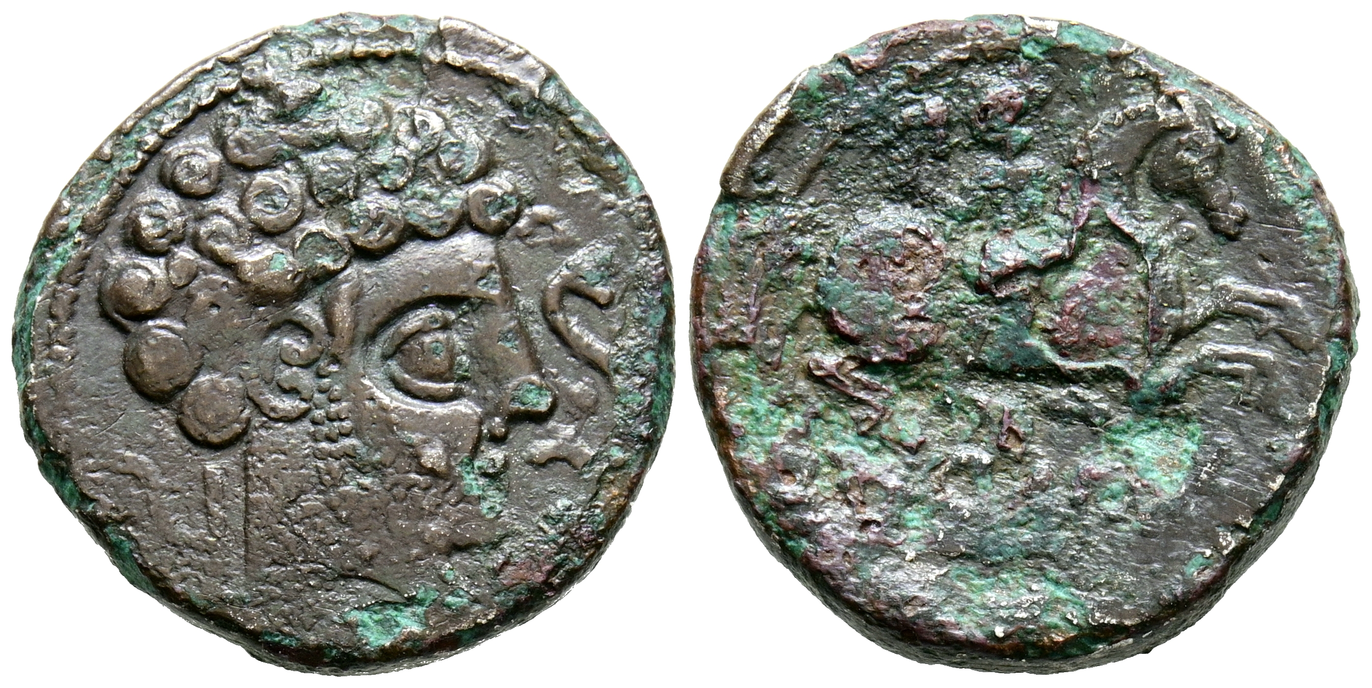 ARSAOS (Zona de Navarra). Denario forrado. (Ar-Ae. 3,69g/19mm). 120-80 A.C. (FAB-139). Anv: Cabeza masculina barbada a derecha, delante delfín, detrás arado. Rev: Jinete con dardo a derecha, debajo leyenda ibérica sobre línea: ARSAOS. MBC.