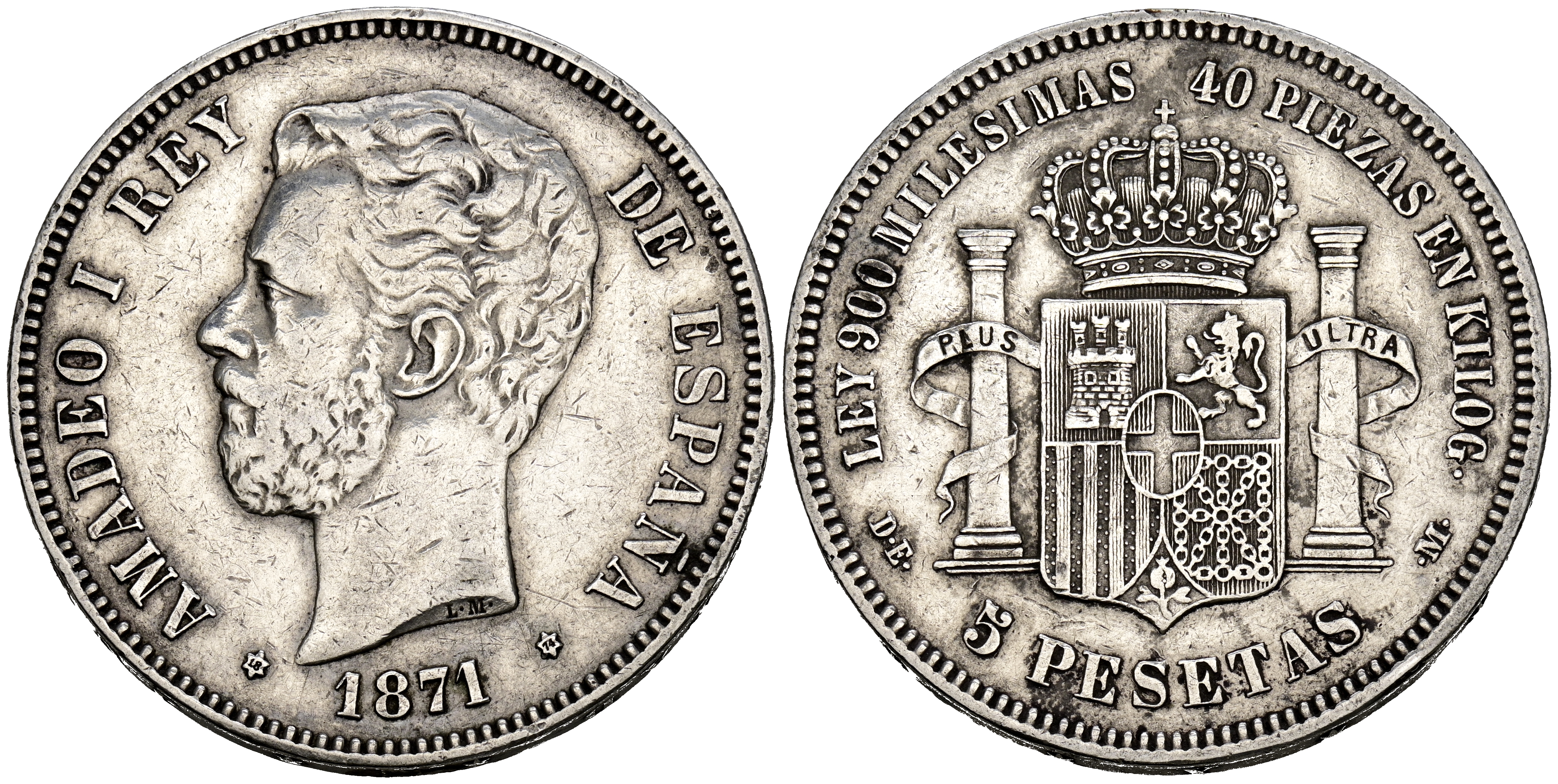 AMADEO I (1871-1873). 5 Pesetas. (Ar. 24,88g/38mm). 1871 *18-74. Madrid DEM. (Cal-2019-5). MBC.