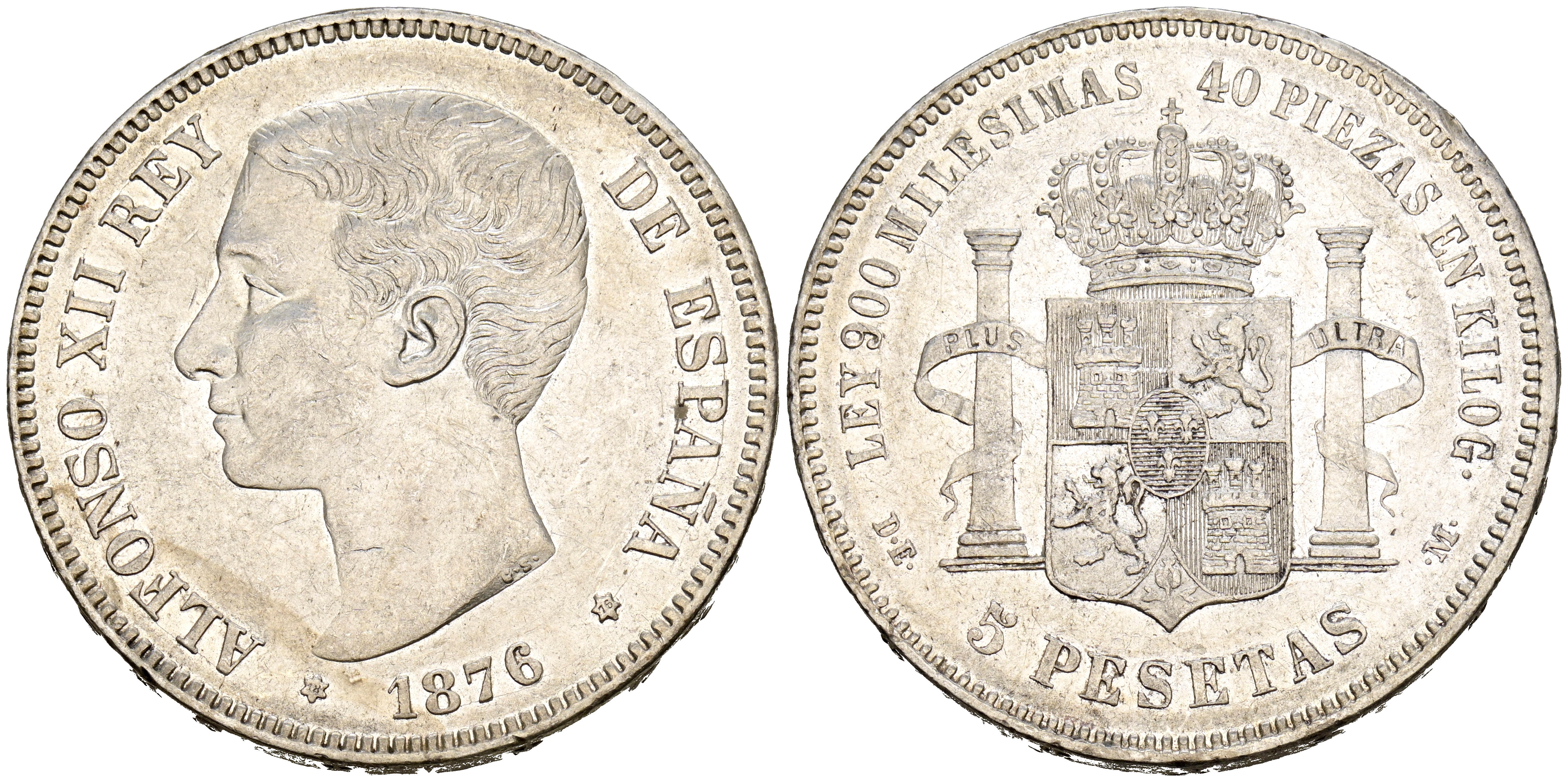 ALFONSO XII (1874-1885). 5 Pesetas. (Ar. 25,06g/37mm). 1876 *18-76. Madrid DEM. (Cal-2019-37). MBC+. Marquitas.