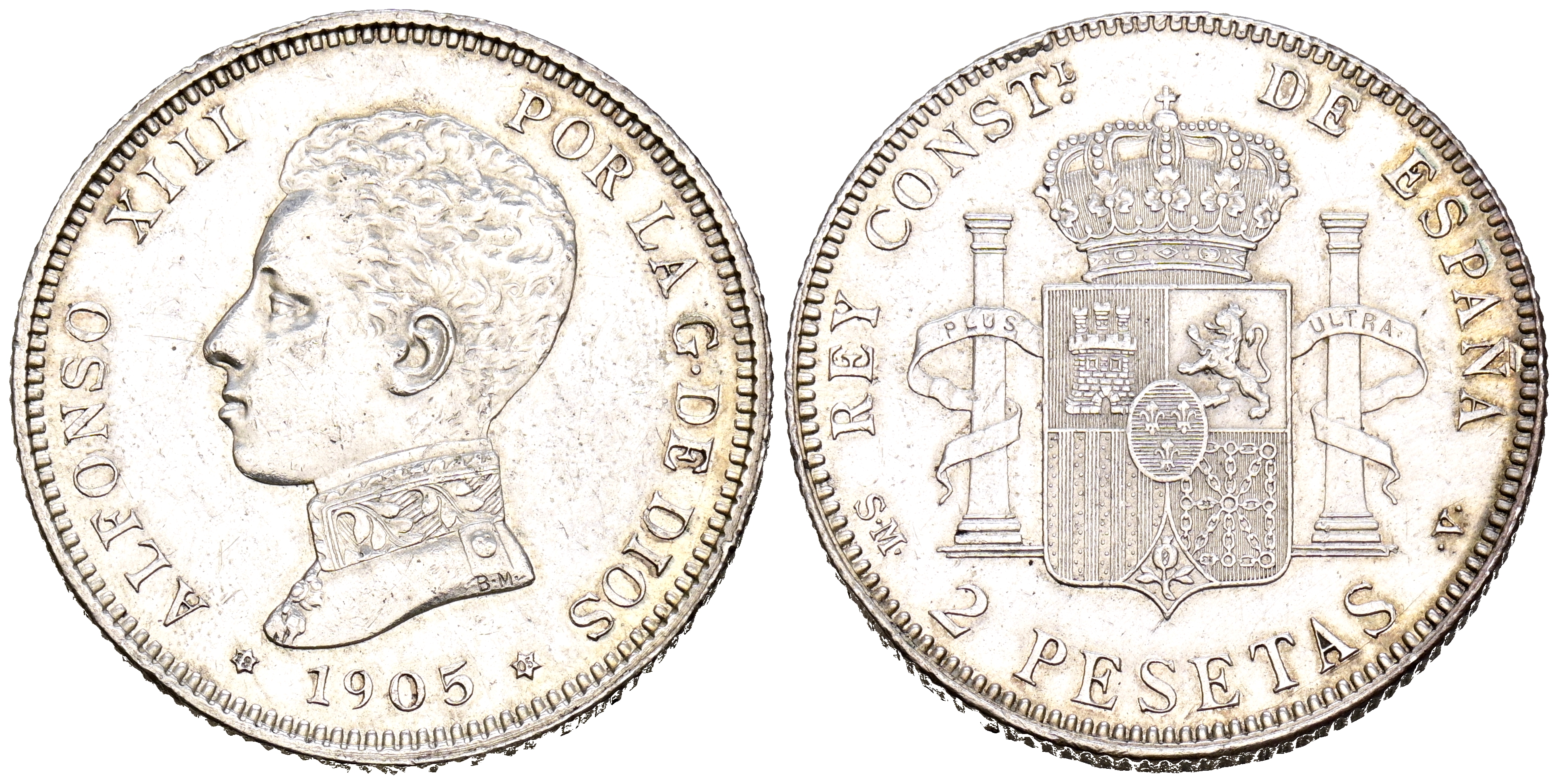 ALFONSO XIII (1885-1931). 2 Pesetas. (Ar. 10,06g/27mm). 1905 *19-05. Madrid SMV. (Cal-2019-88). EBC. Ligeras marquitas.