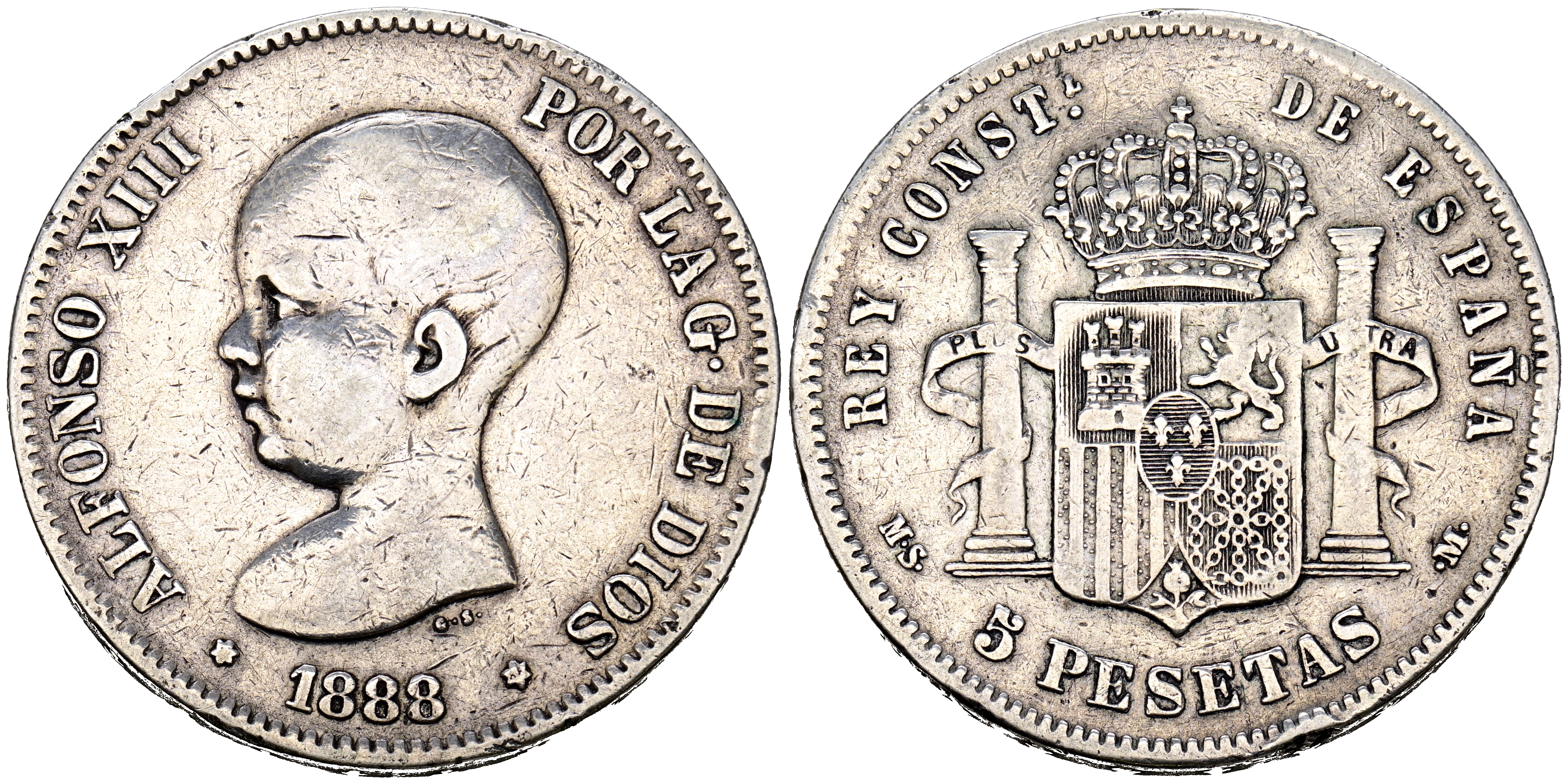 ALFONSO XIII (1885-1931). 5 Pesetas. (Ar. 24,60g/37mm). 1888 *18-88. Madrid MSM. (Cal-2019-89). MBC-. Rara. Estrellas muy flojas, la primera prácticamente no visible. Limpiada.