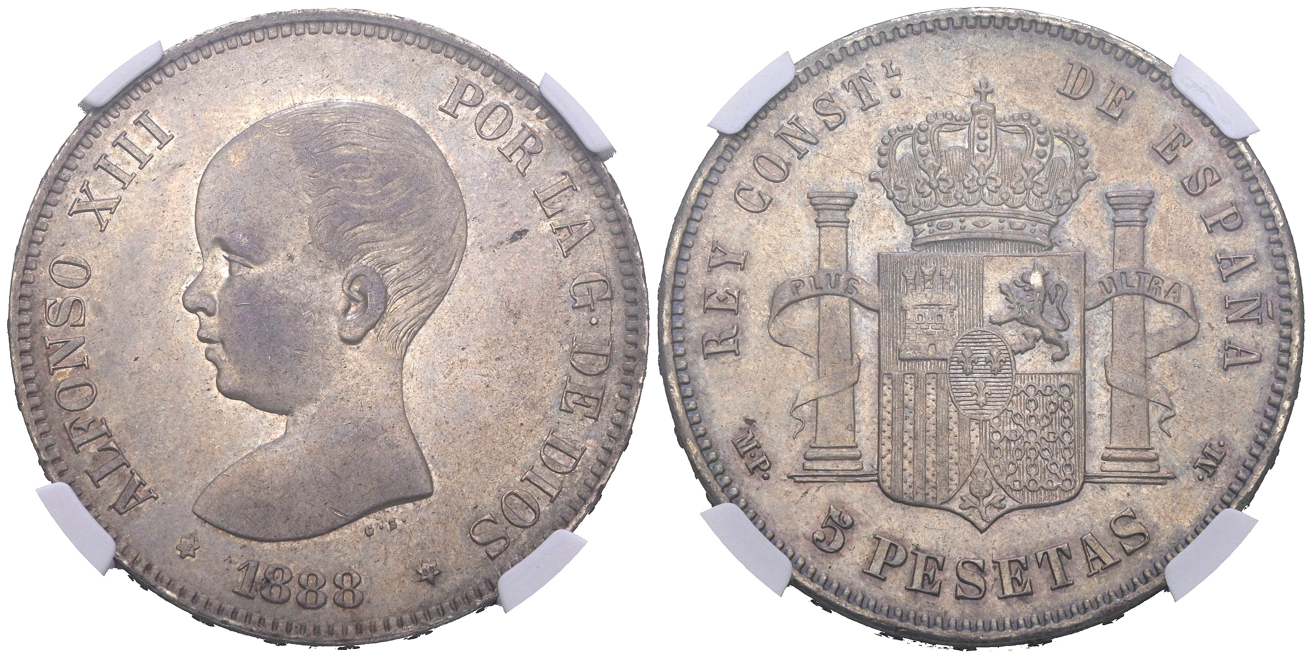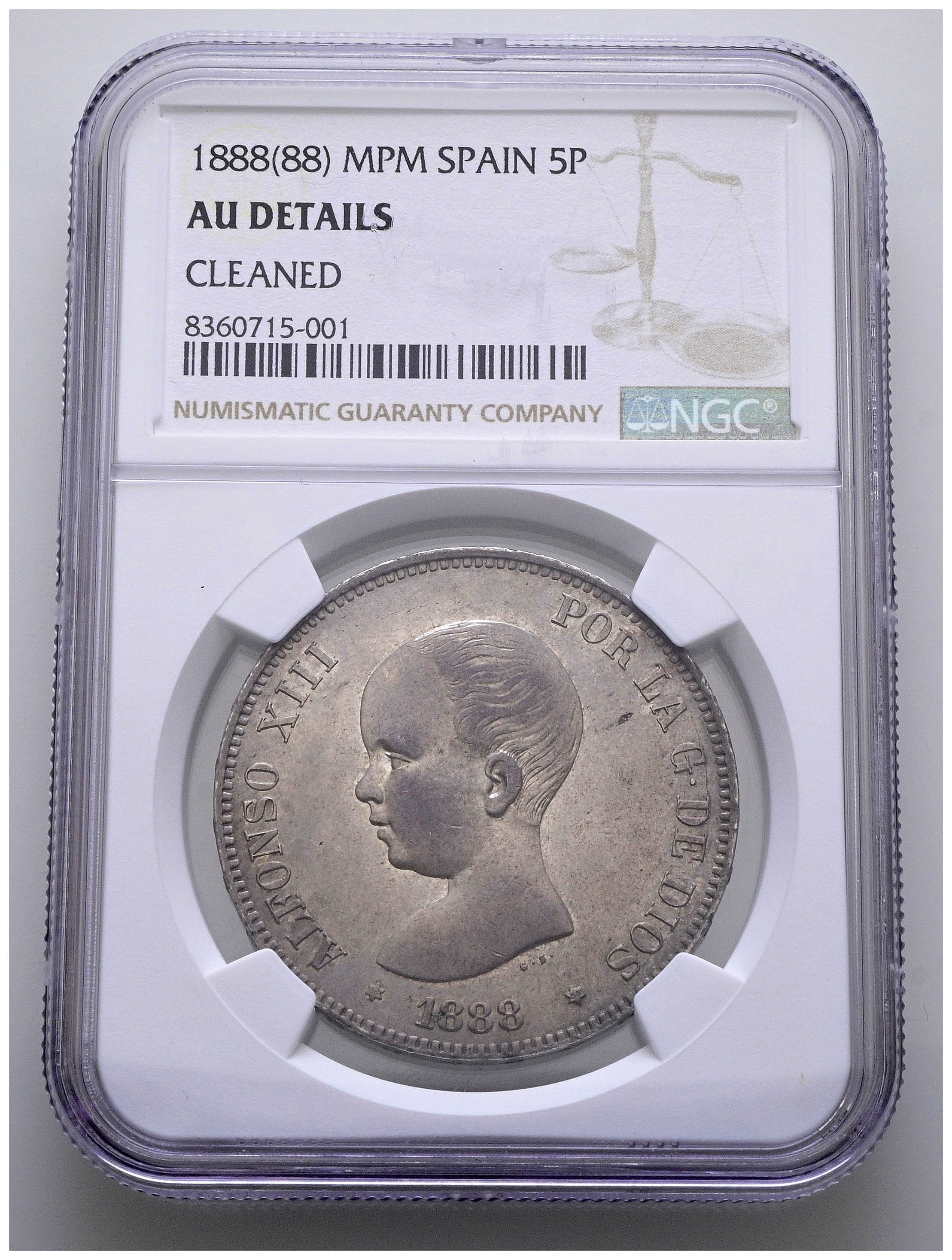 ALFONSO XIII (1885-1931). 5 Pesetas. (Ar. 25,00g/37mm)*. 1888 *18-88. Madrid MPM. (Cal-2019-92). Encapsulada por NGC AU Details, Cleaned. *Peso y medidas teóricos.