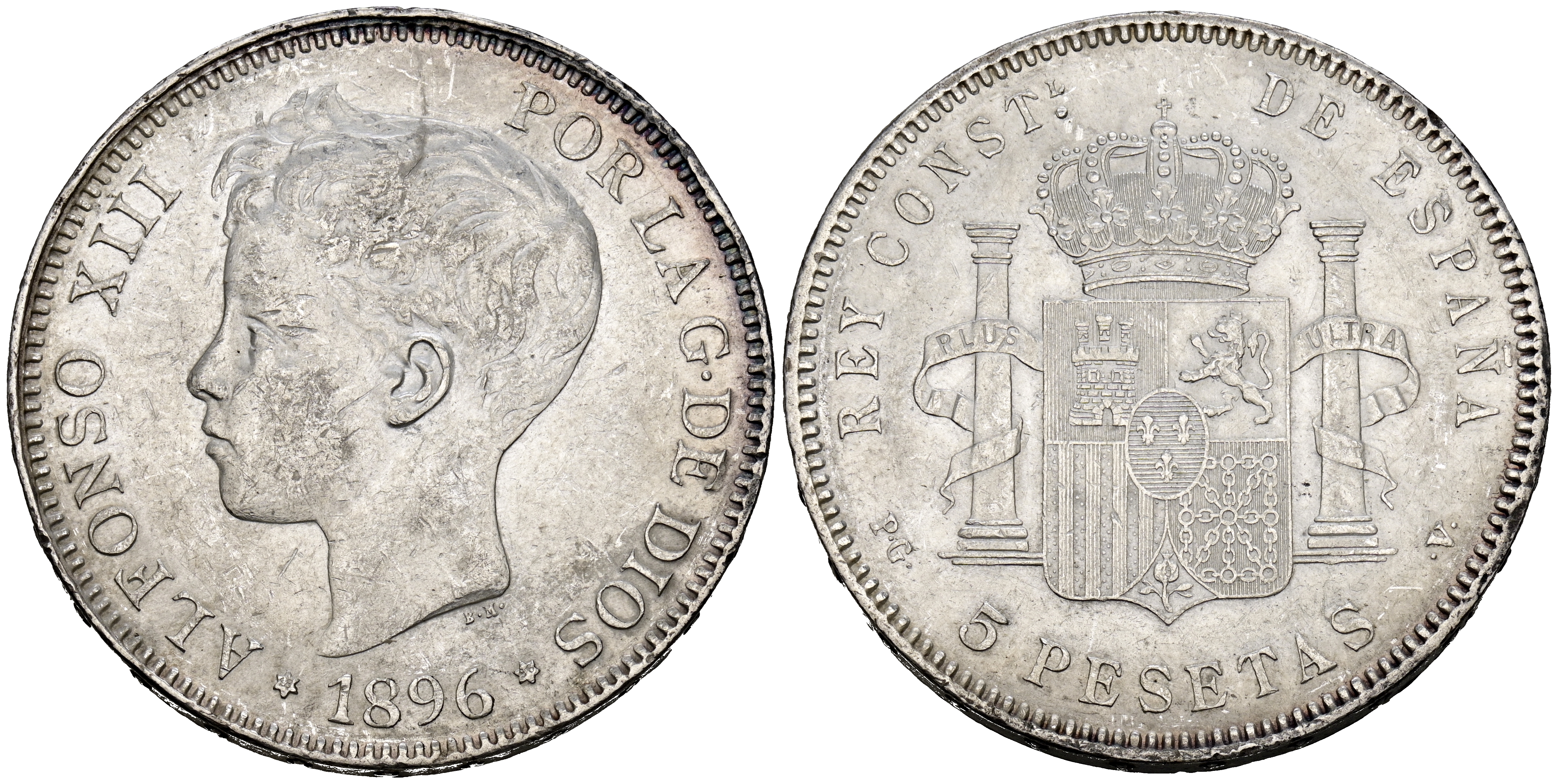 ALFONSO XIII (1885-1931). 5 Pesetas. (Ar. 24,95g /37mm). 1896 *18-96. Madrid PGV. (Cal-2019-106). MBC+. Restos de brillo original. Golpecitos.
