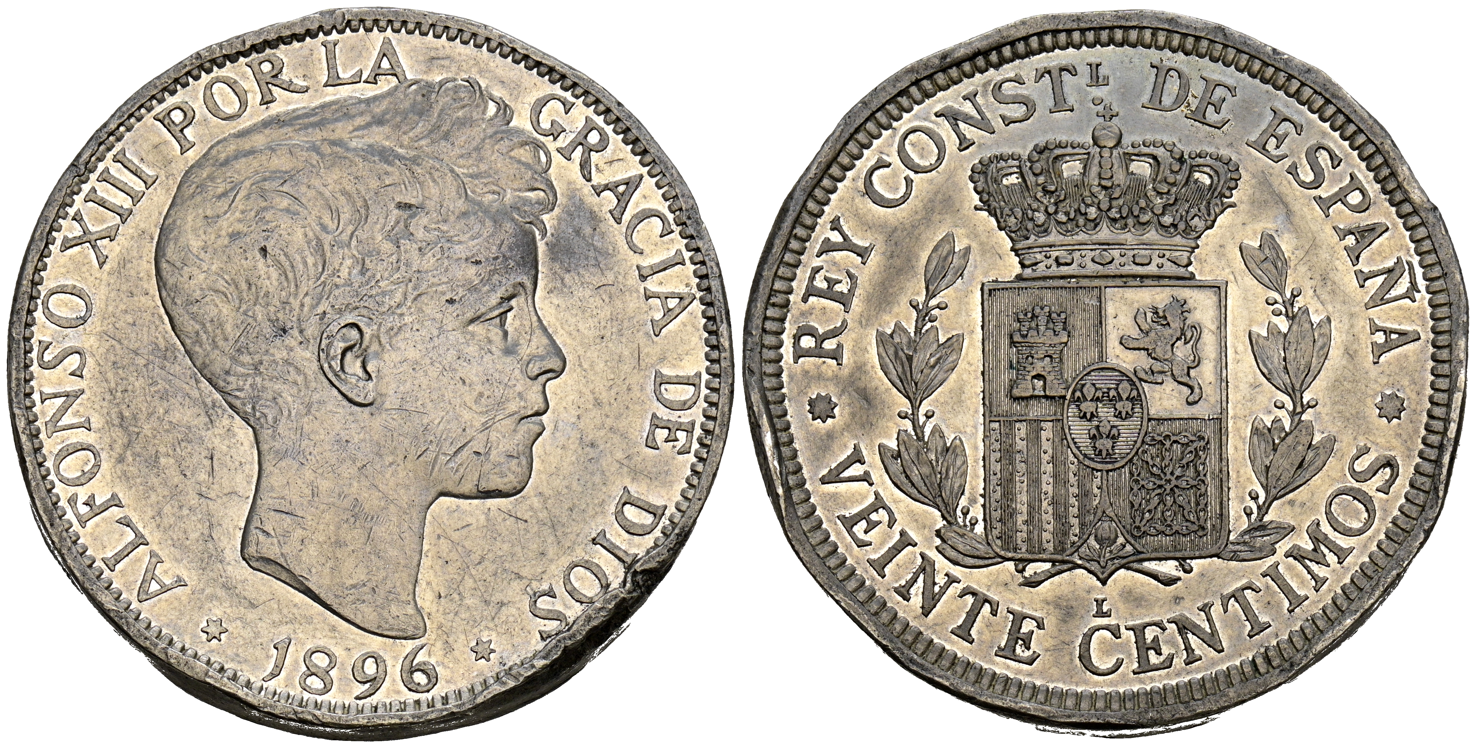 ALFONSO XIII (1885-1931). 20 Céntimos. (Sn. 17,23g/30mm). 1896. Londres L. (Cal-2019-129). MBC. Bonito tono. Golpes en canto y listel.Esta pieza forma parte de las acuñaciones particulares que llevó a cabo Sir Reginald Huth y que también existen en otros materiales como cobre, hierro o platino, siendo el de esta pieza, el estaño, de los más escasos. Pieza de fantasía que con el paso del tiempo ha adquirido interés entre muchos coleccionista.