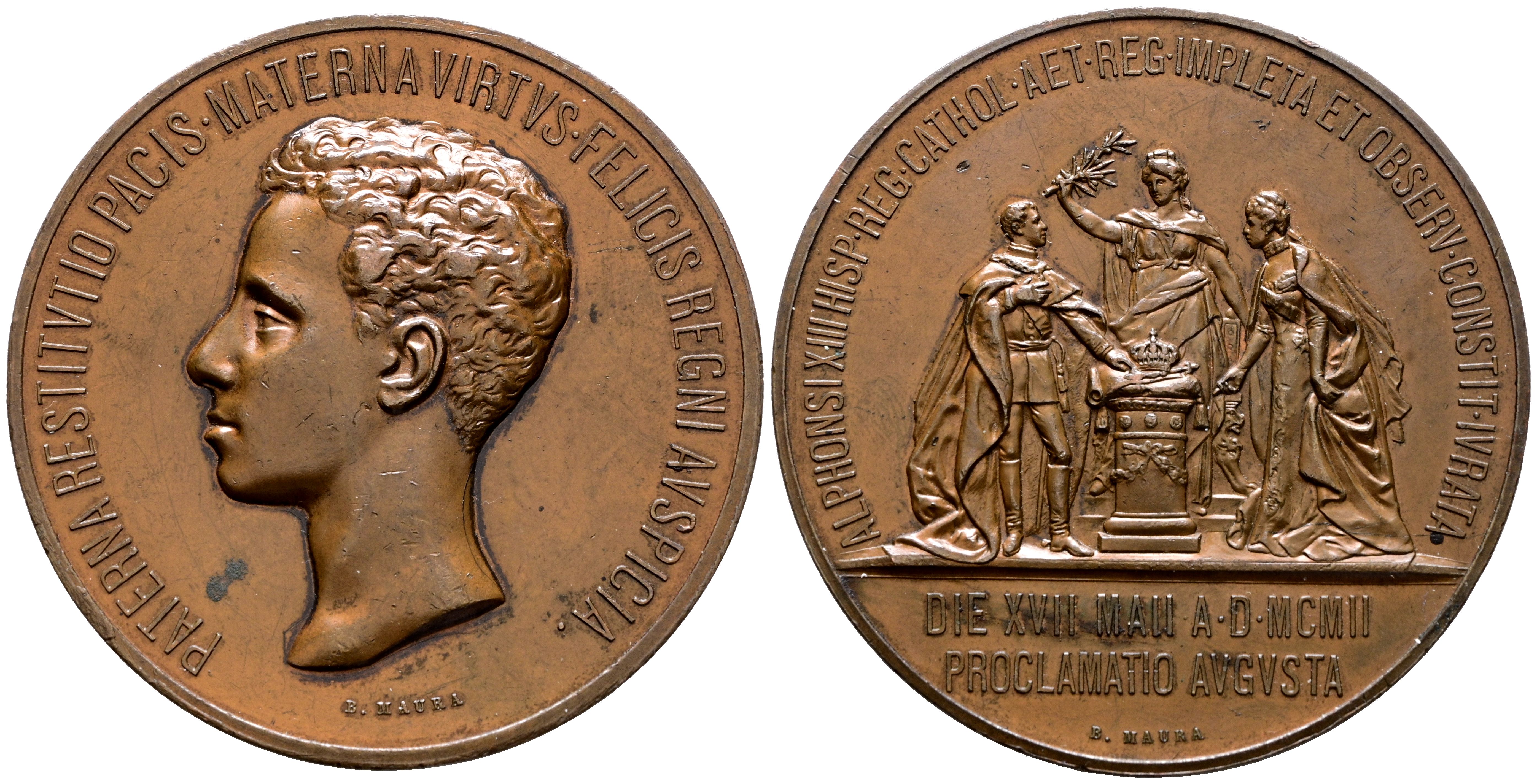 ALFONSO XIII (1885-1931). Medalla de proclamación. (Ae. 87,95g/60mm). 1902. Madrid. (Vives 595 var). Anv: Cabeza de Alfonso XIII a la izquierda, alrededor leyenda: PATERNA RESTITVTIO PACIS VIRTVS MATERNAS FELICIS REGNIAVSPICIA. Rev: Alfonso XIII en su jura de proclamación frente a la Reina Madre, entre ellos sobre una columna, la corona y el cetro como símbolos de la monarquía que son entregados por María Cristina, detrás, alegoría de España, en exergo: DIE XVII MAII A D MCMII / PROCLAMATIO AVGVSTA, alrededor leyenda: ALPHONSI XIII HISP REG CATHOL AET REG IMPLETA ET OBSERV CONSTIT IVRATA. Grabador: D. Maura. MBC+.
