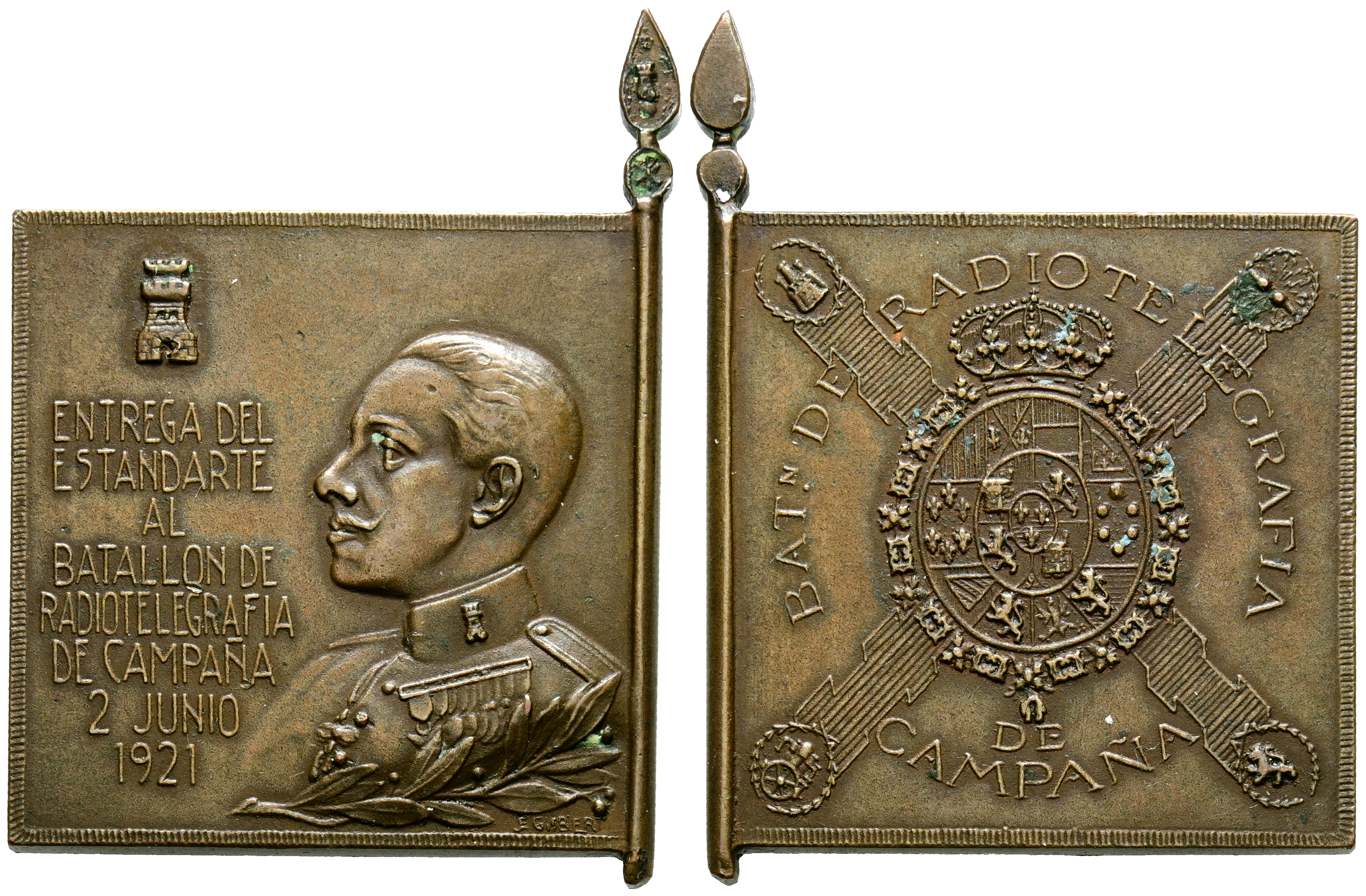 ALFONSO XIII (1885-1931). Medalla. (Ae. 15,93g/32mm). Entrega de estandarte al Batallón de Radiotelegrafía de campaña. 1921. Grabador: E. Gisbert. Módulo cuadrado con lanza. EBC-. Escasa.