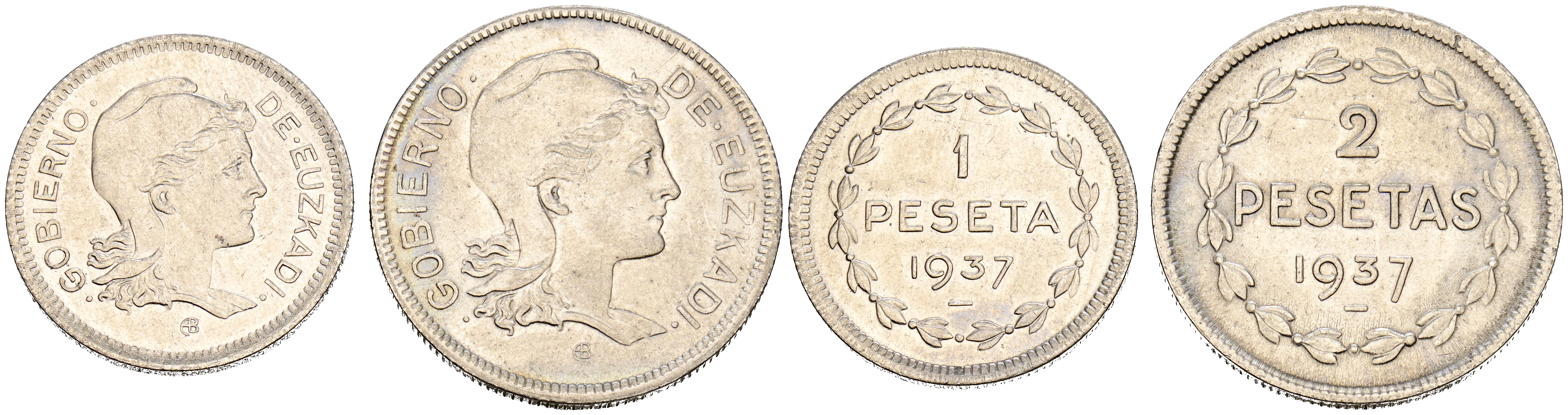 EUZKADI. Pareja de 1 y 2 Pesetas del Gobierno de Euzkadi acuñadas en 1937. (Cal-2019-14/15). SC.