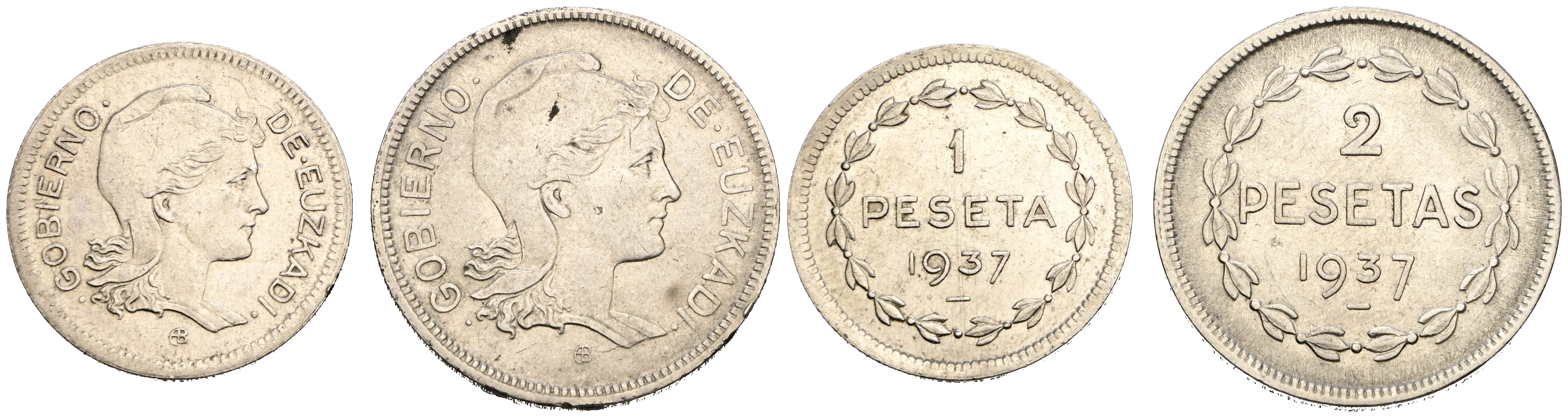 EUZKADI. Pareja de 1 y 2 Pesetas del Gobierno de Euzkadi acuñadas en 1937. (Cal-2019-14/15). Buena conservación general. A EXAMINAR.