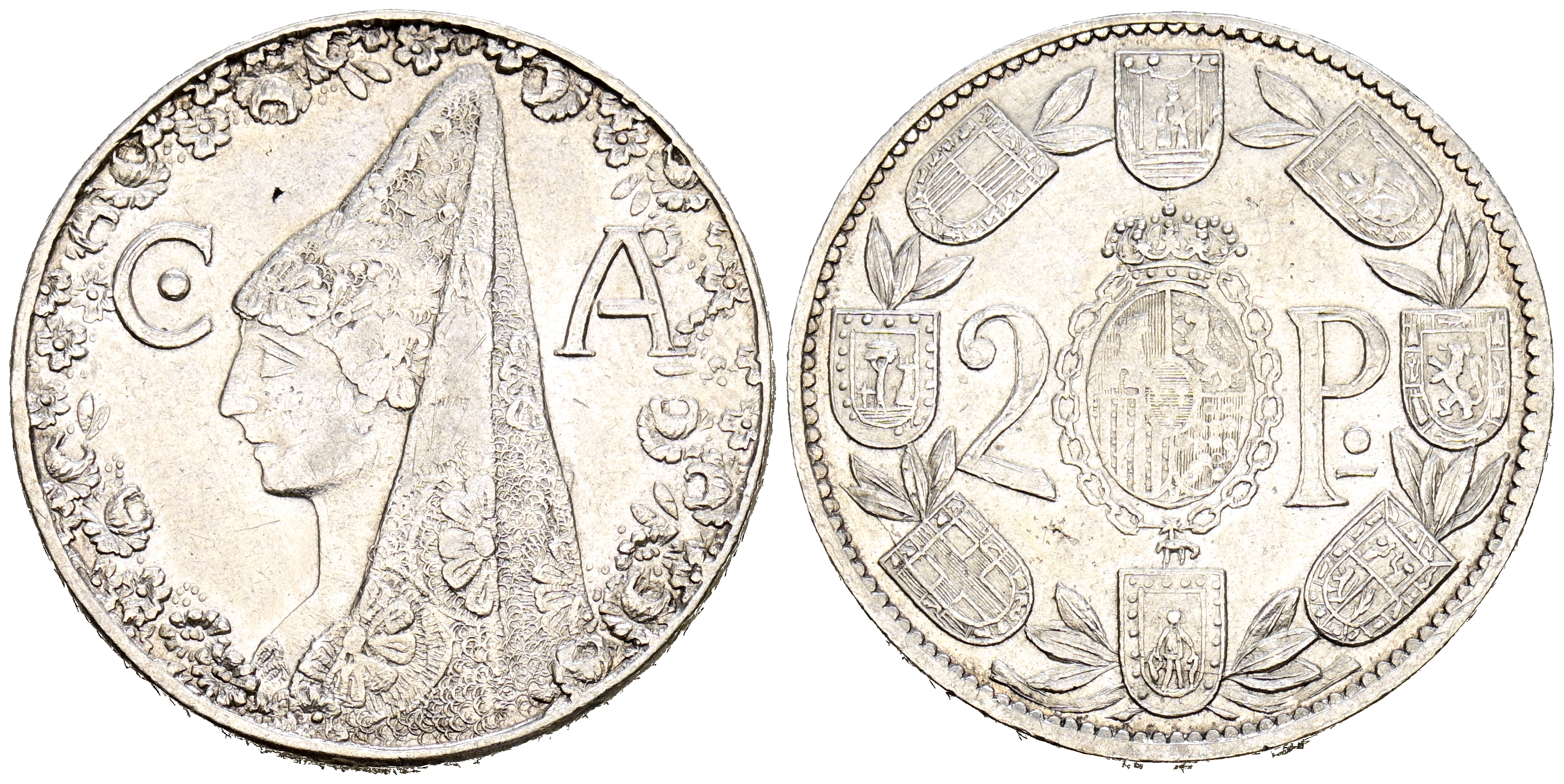 Ficha de casino. 2 Pesetas. (Ar. 9,66g/30mm). S/D. Atribuída a algún casino de Andalucía. EBC. Rara.