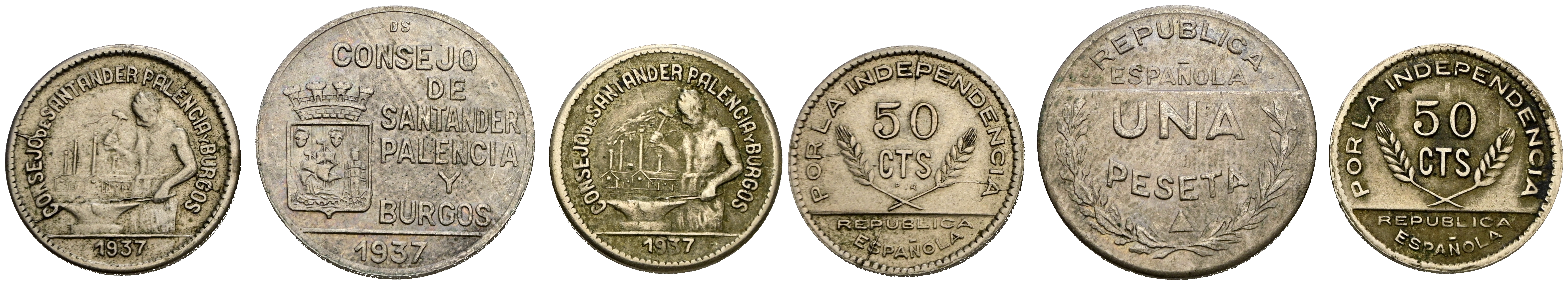 CONSEJO DE SANTANDER, PALENCIA Y BURGOS. Serie completa de esta serie formada por dos piezas de 50 Céntimos (con y sin PJR) y 1 Peseta. Diferentes estados de conservación. A EXAMINAR.
