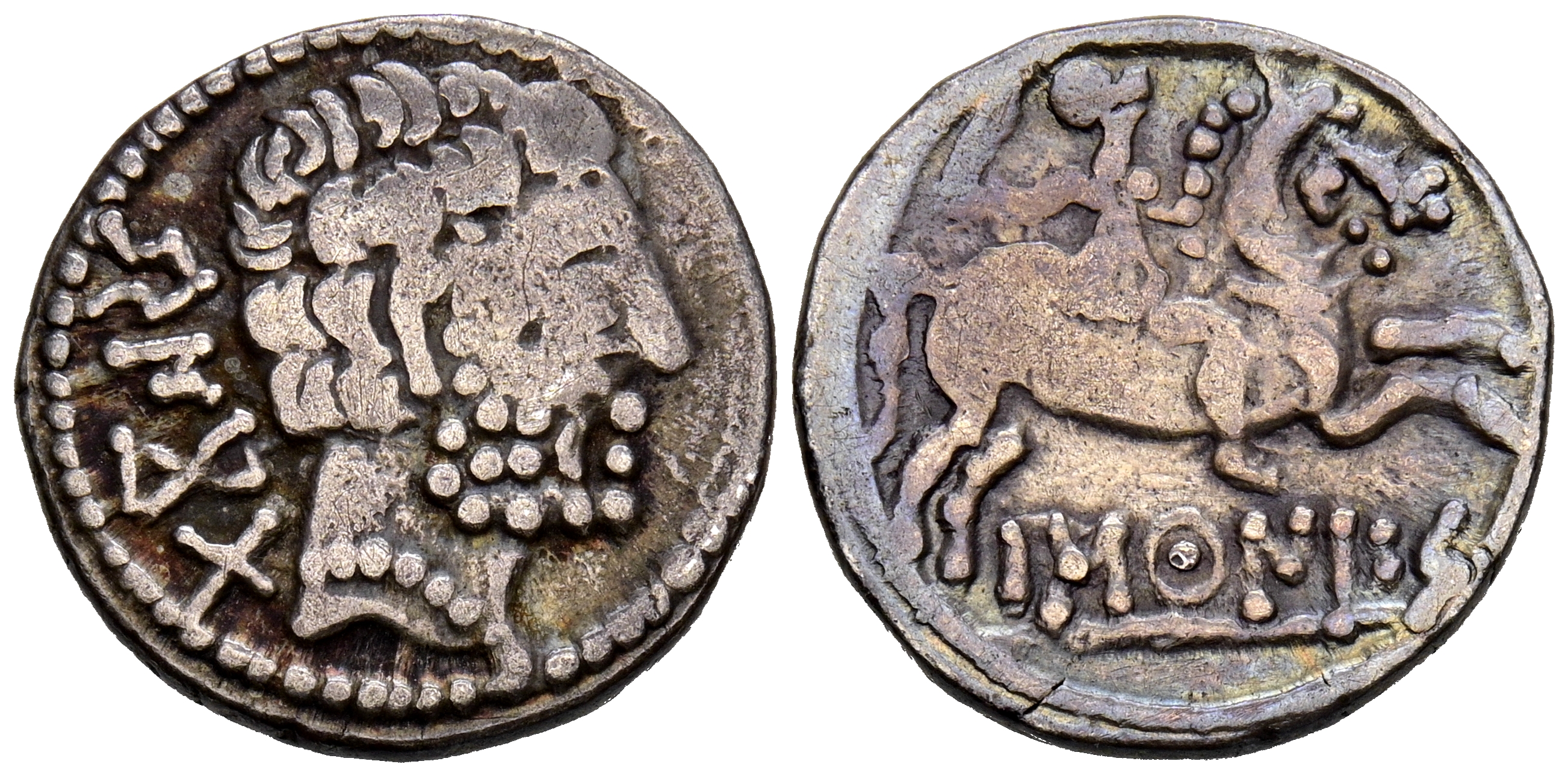BASCUNES (Pamplona). Denario. (Ar. 3,62g/18mm). 120-20 a.C. (FAB-215). Anv: Cabeza masculina barbada a derecha, detrás leyenda ibérica: BeNCoDa. Rev: Jinete con espada a derecha, debajo leyenda ibérica: BaSCuNES. MBC.