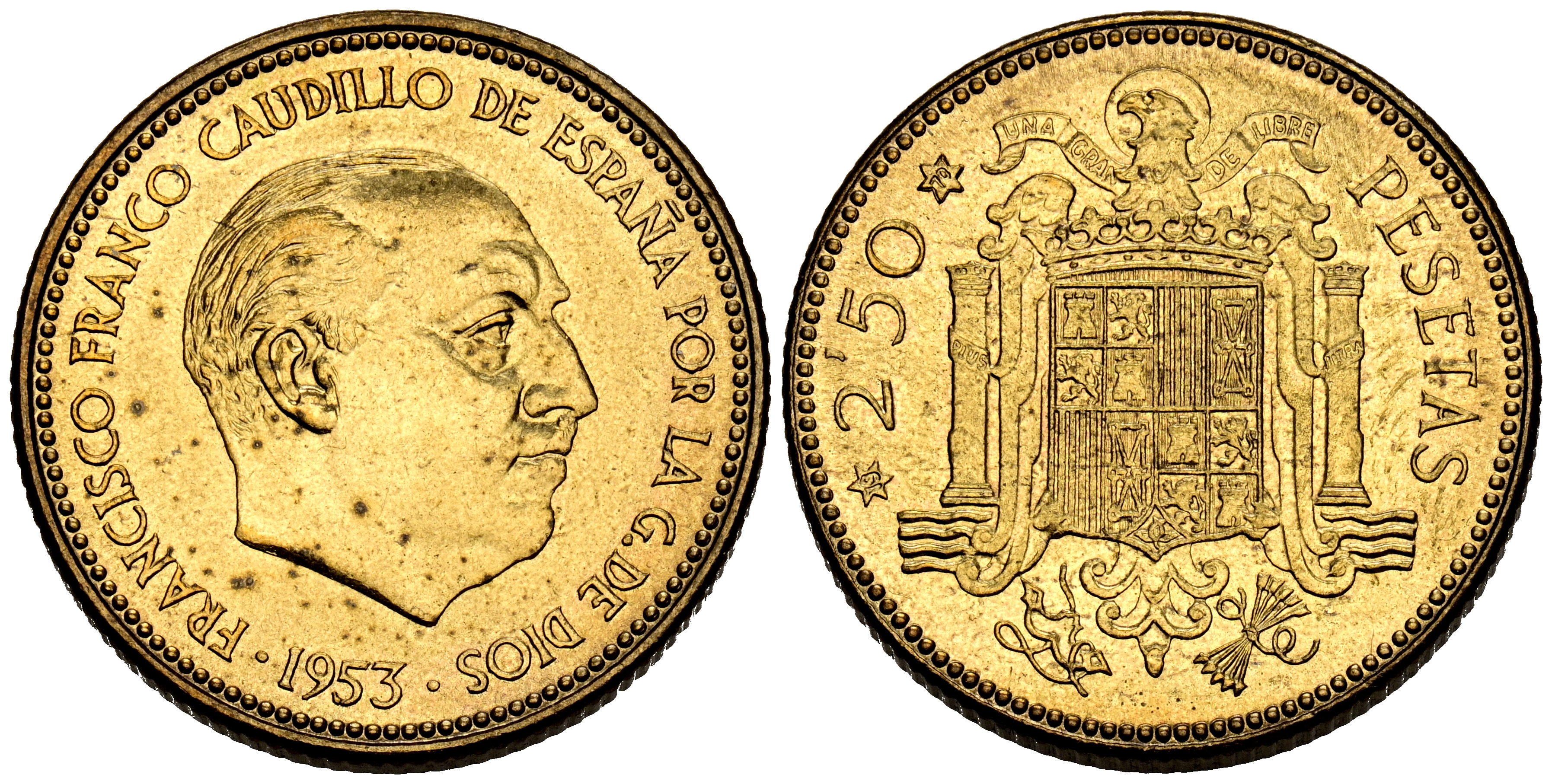 ESTADO ESPAÑOL (1936-1975). 2,50 Pesetas. (Al-Ae. 6,86g/25mm). 1953 *19-70. Madrid. (Cal-2019-89). SC. Extraída de tira. Escasa.