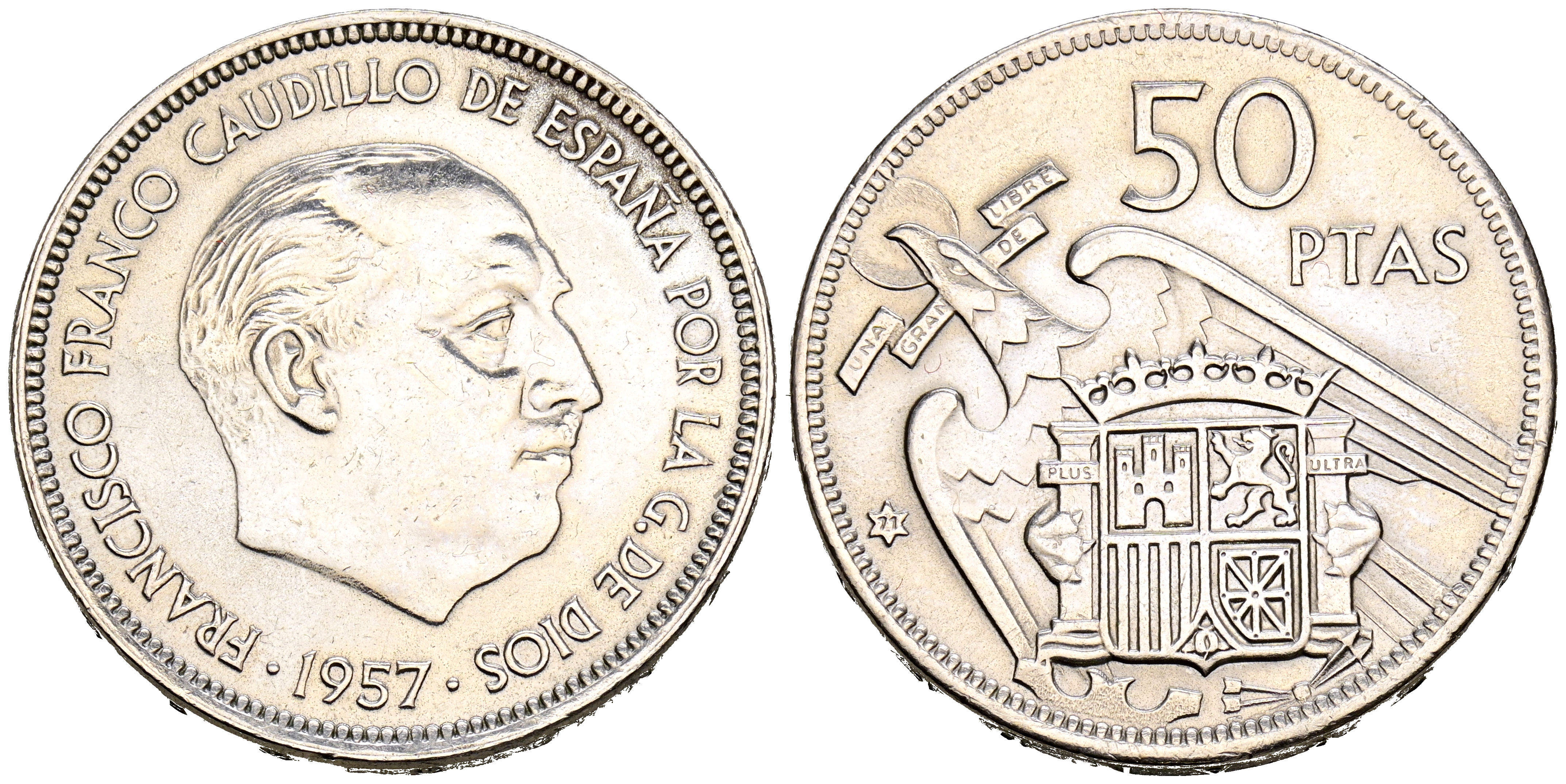 ESTADO ESPAÑOL (1936-1975). 50 Pesetas. (Ni. 12,55g/30mm). 1957 *71. Madrid. (Cal-2019-140). EBC. Limpiada.