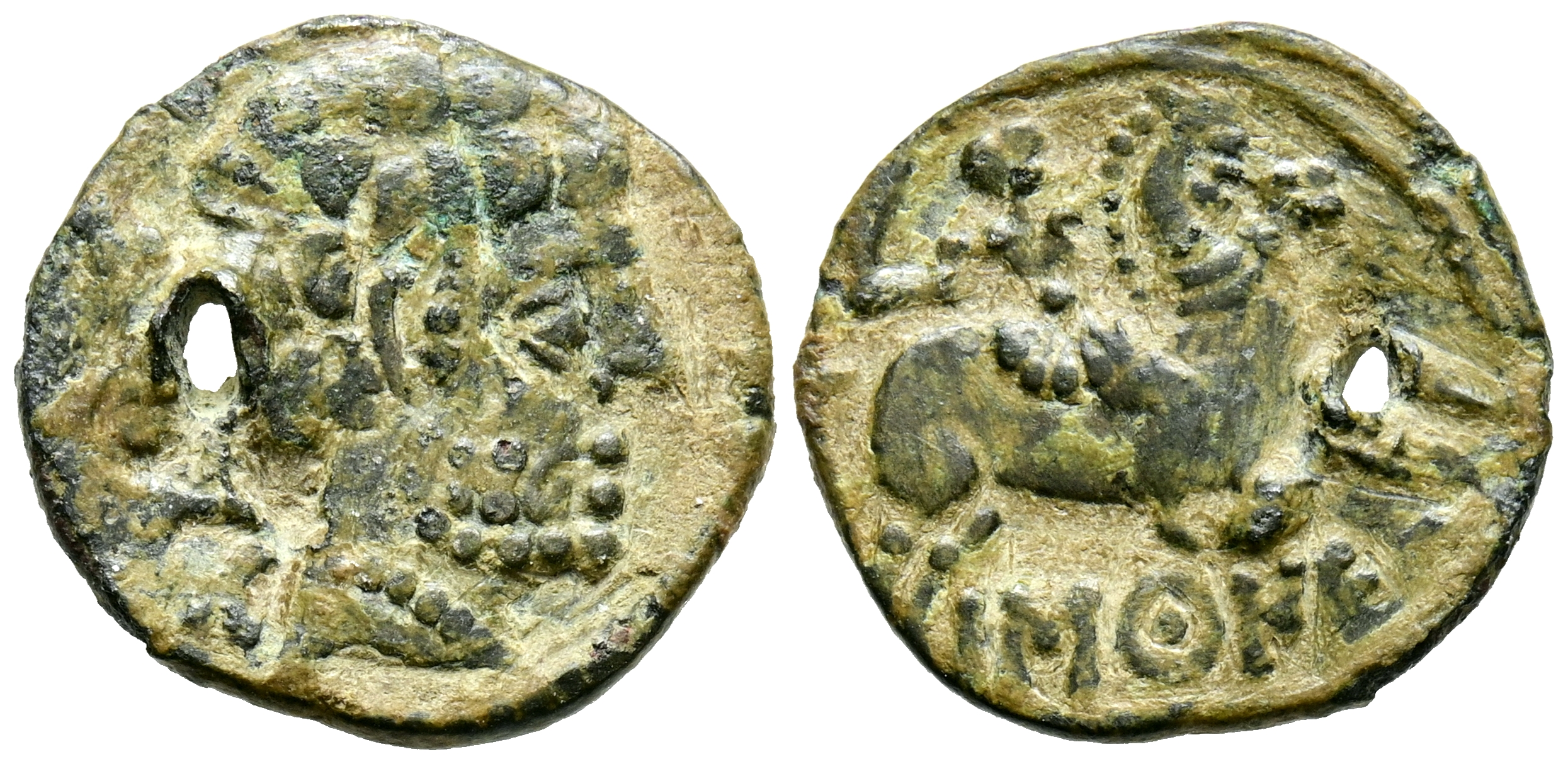 BASCUNES (Pamplona). Denario forrado (Ae. 1,66g/17mm). 120-20 a.C. (FAB-215). Anv: Cabeza masculina barbada a derecha, detrás leyenda ibérica BeNCoDa. Rev: Jinete con espada a derecha, debajo leyenda ibérica BaSCuNES. MBC-. Perforación.