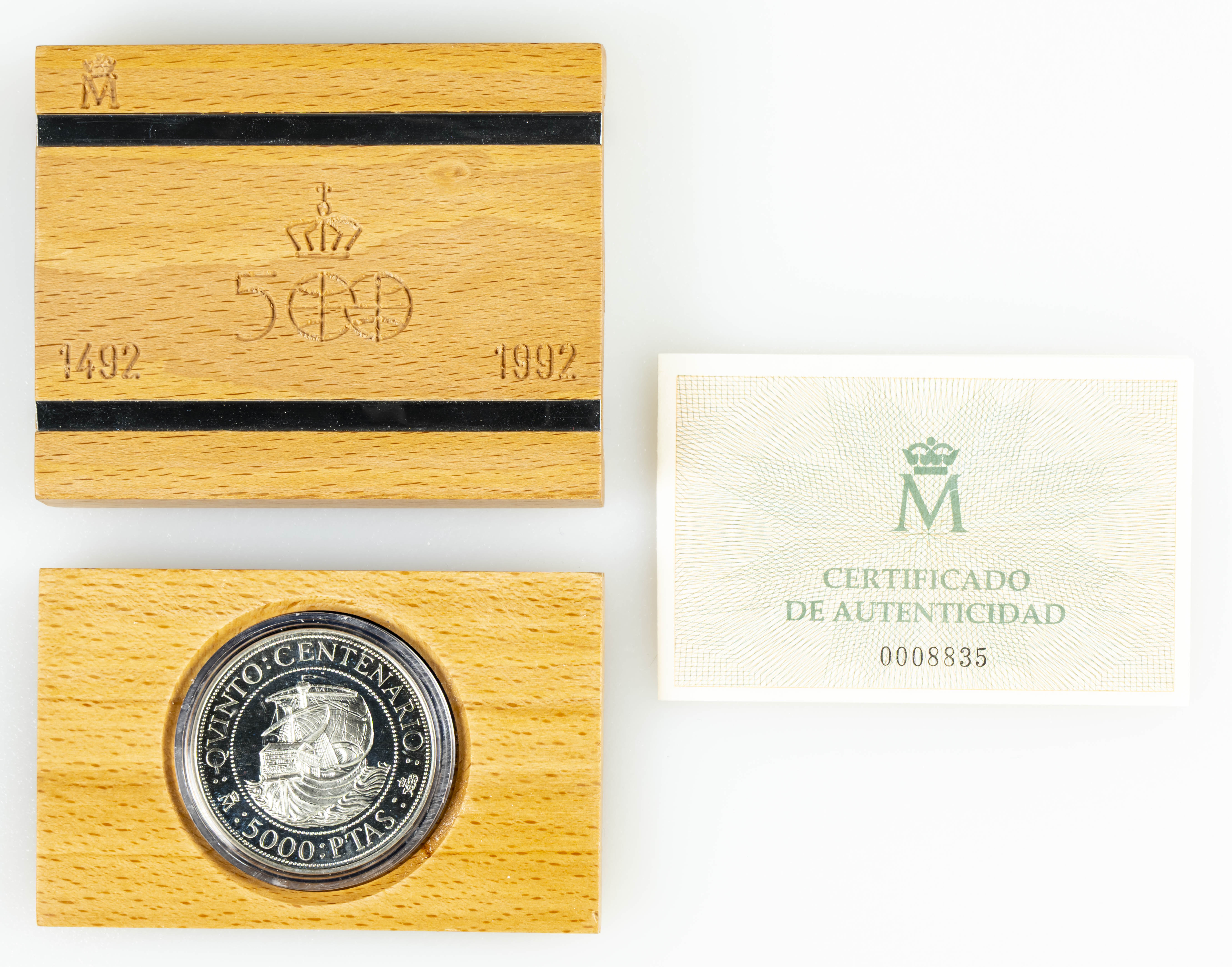 JUAN CARLOS I (1975-2014). 5000 pesetas. (Ar. 54,00g/40mm). 1989. FNMT. Quinto Centenario. Serie I. PROOF. Incluye estuche original y certificado de autenticidad.
