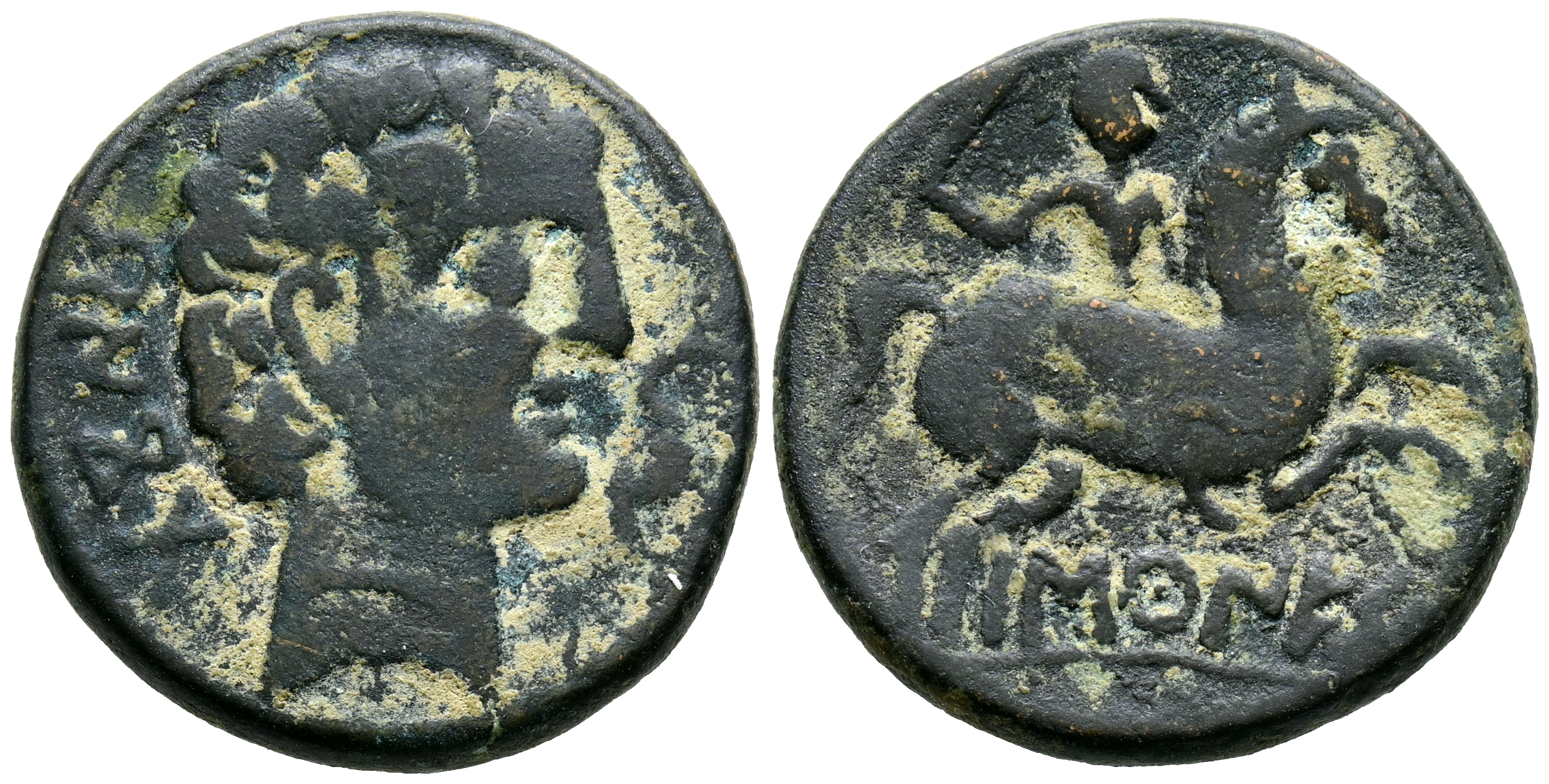 BASCUNES (Pamplona, Navarra). As. (Ae. 8,52g/23mm). 120-20 a.C. (FAB-220).Anv: Cabeza barbada a derecha, detrás leyenda ibérica: BeNCoDa, delante delfín. Rev: Jinete con espada a derecha, debajo leyenda ibérica: BaSCUNES. MBC-. Limpiada.