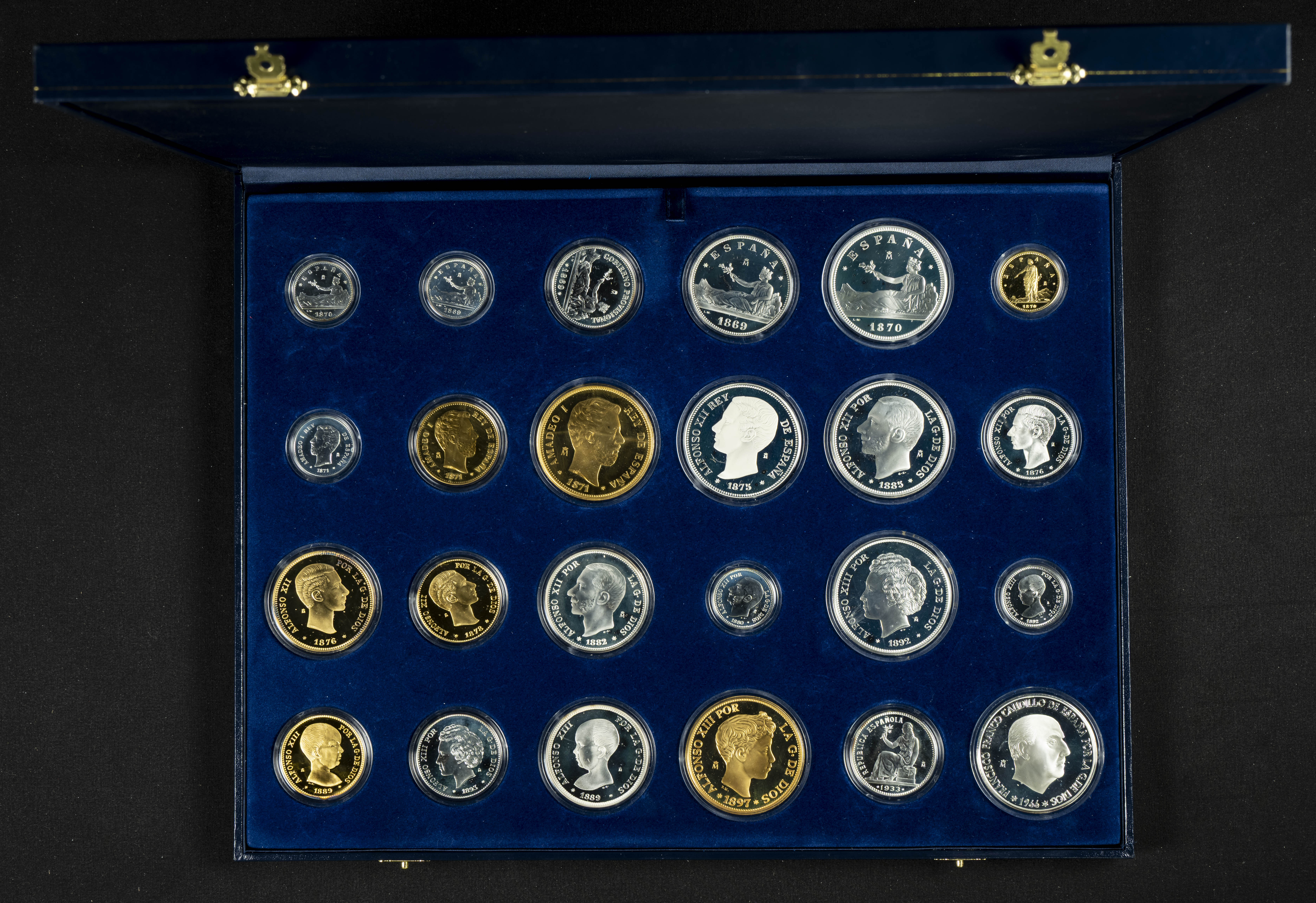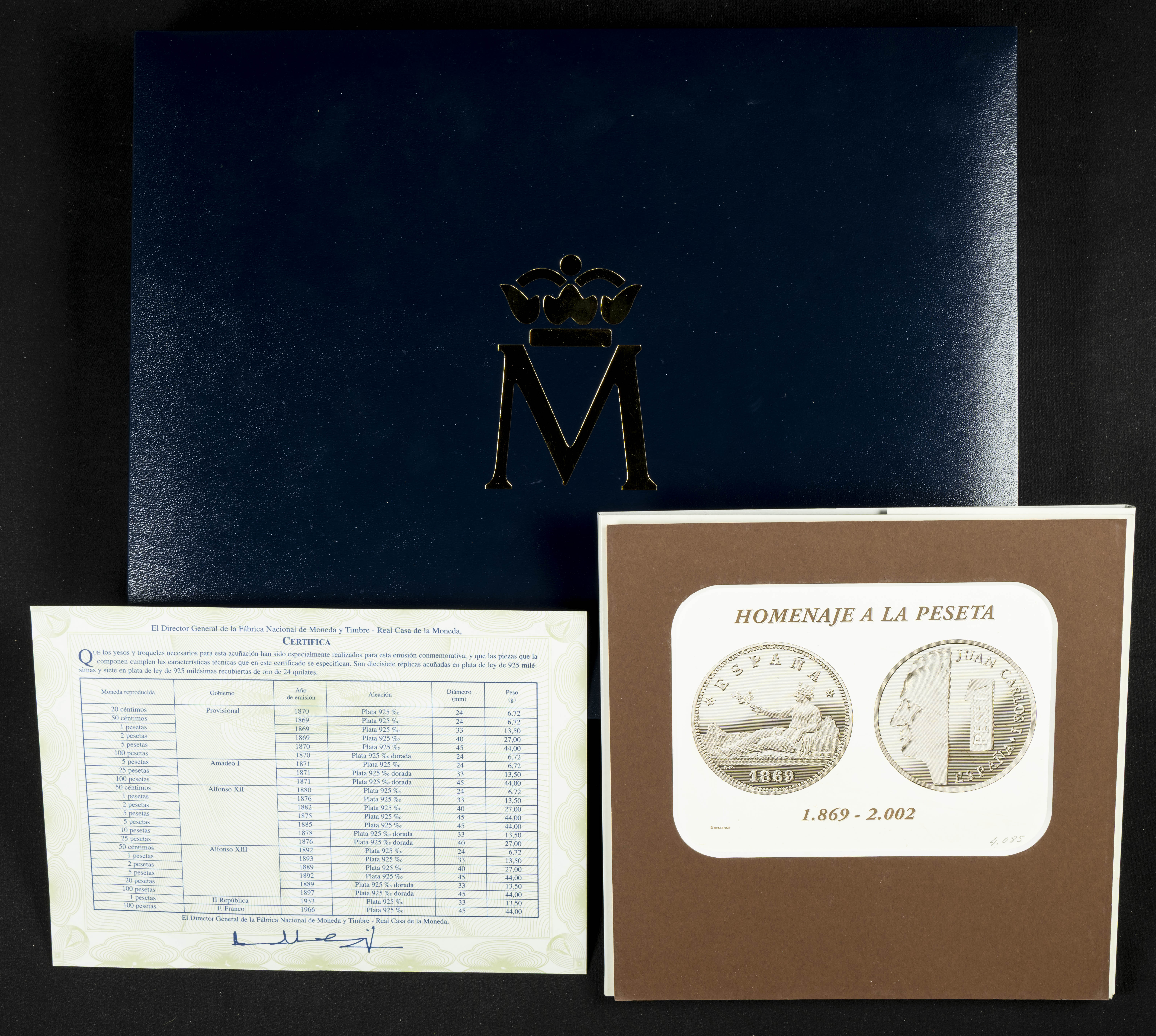 JUAN CARLOS I (1975-2014). Historia de la Peseta. FNMT. Emisión de las réplicas de 24 Monedas icónicas de la numismática española en plata y plata con baño de oro. Plata de 0,925 milésimas. PROOF. Incluye estuche original y certificado de autenticidad.
