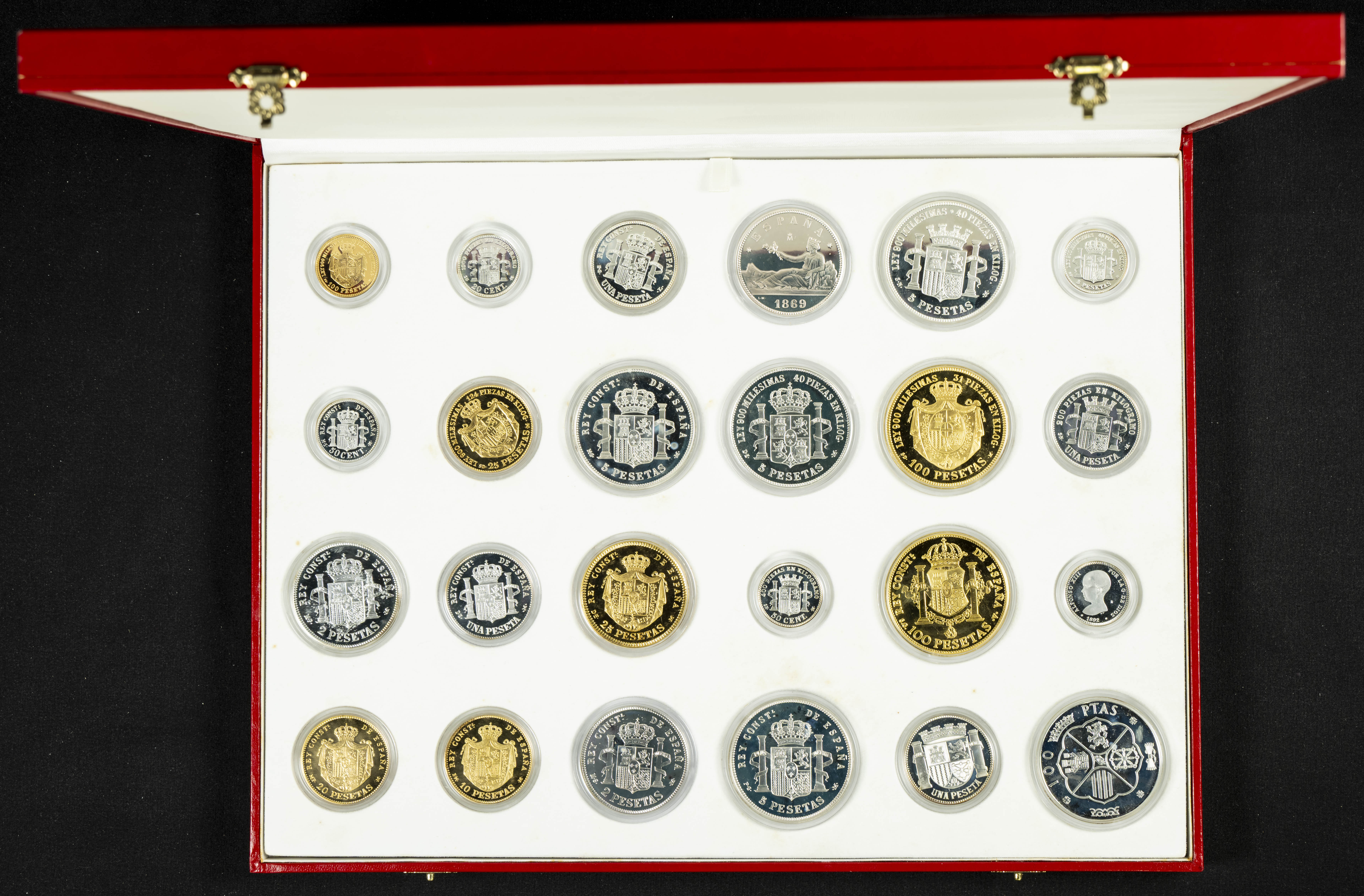 JUAN CARLOS I (1975-2014). Historia de la Peseta. Emisión de las réplicas de 24 Monedas icónicas de la numismática española en plata y plata con baño de oro. FNMT. PROOF. Incluye estuche original y certificado de autenticidad.