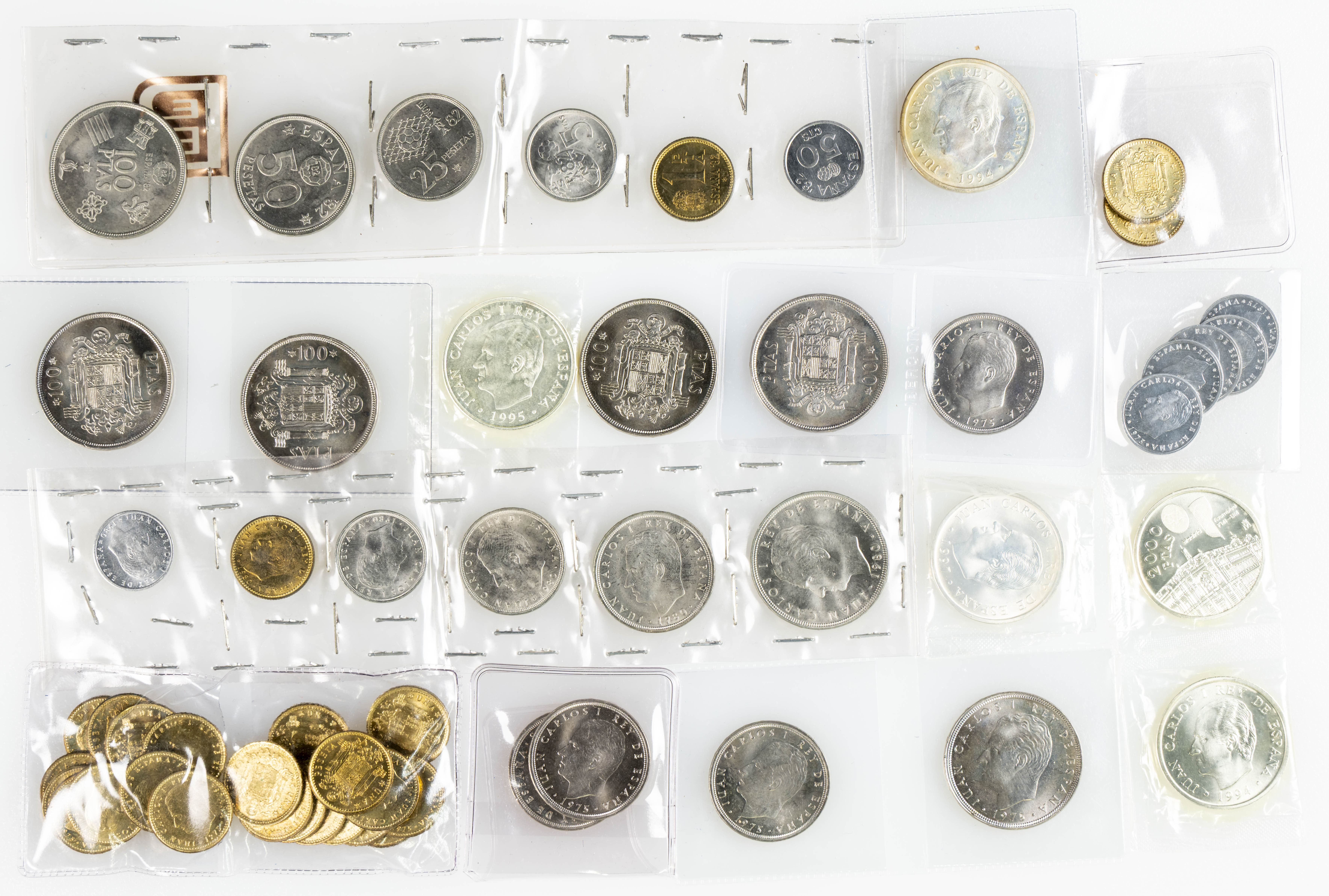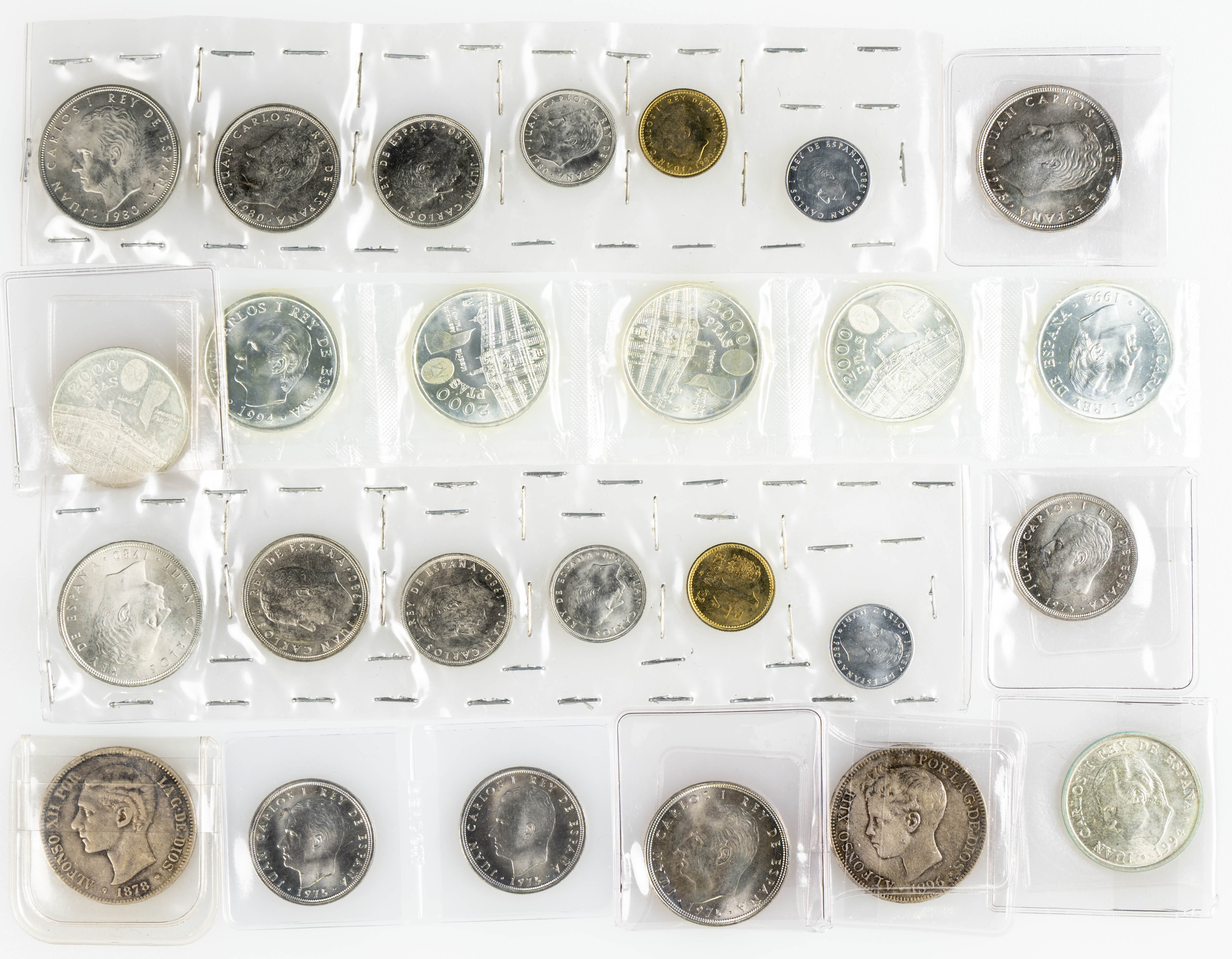 JUAN CARLOS I (1975-2014). Interesante conjunto de alrededor de 200 piezas de este periodo donde destacan 12 monedas en plata de 2000 Pesetas y algunos cartuchos. El conjunto se completa con 2 Duros del Centenario. Diferentes estados de conservación. A EXAMINAR.
