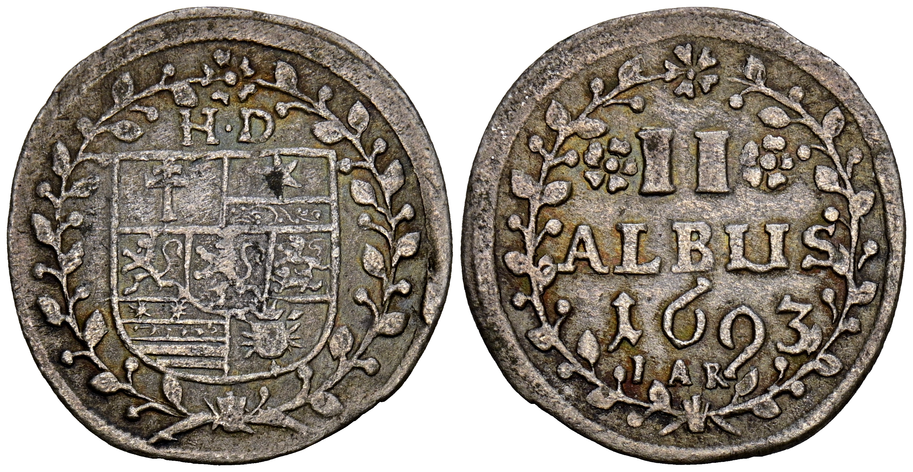 ALEMANIA, Ernst Ludwig (1678–1739). 2 Albus (Ar. 1,52g/22mm). 1693. Landgraviato de Hesse-Darmstadt (Sacro Imperio Romano Germánico). (Km#82). MBC. Escasa.