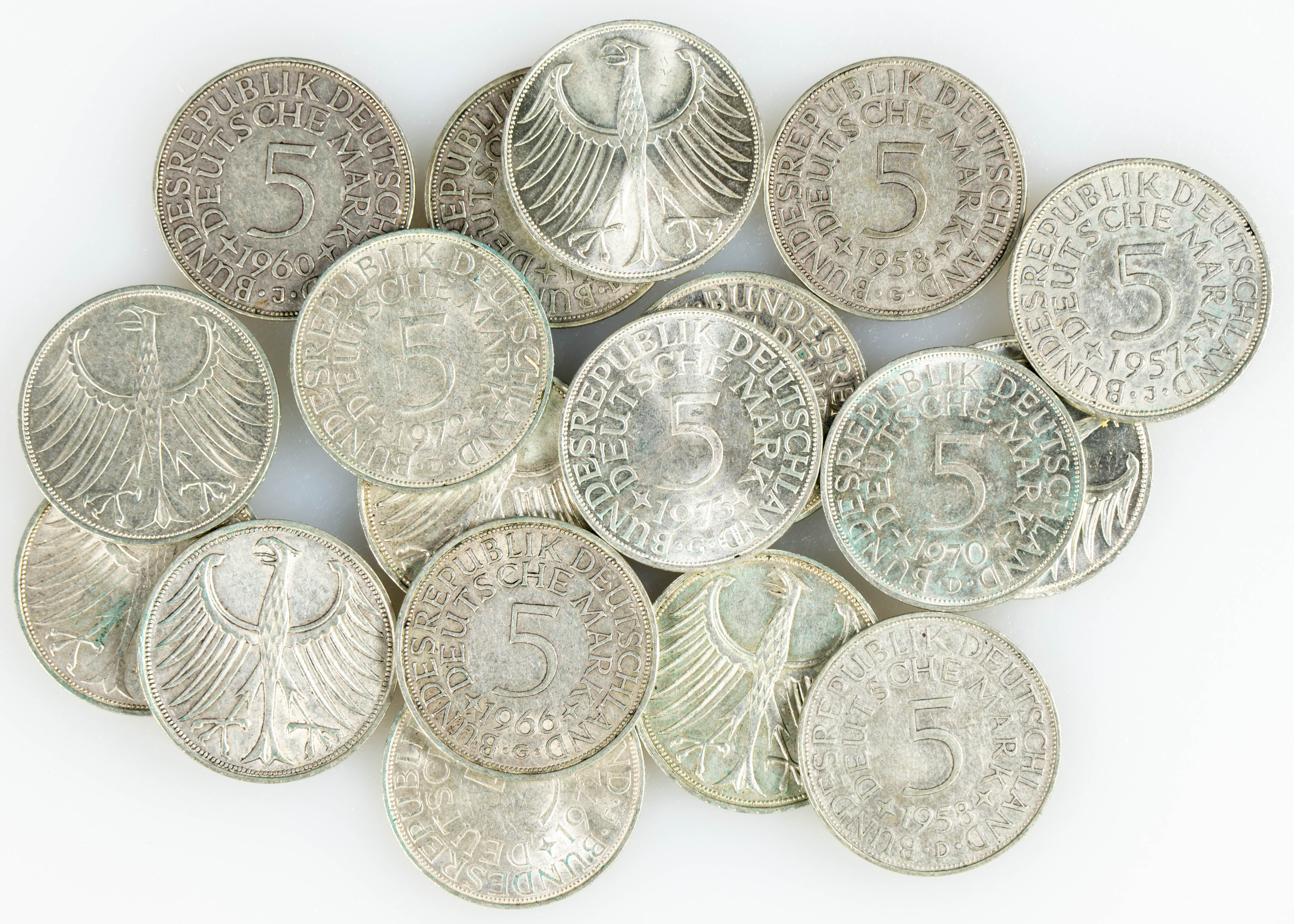 ALEMANIA. Conjunto de 18 monedas de 5 Mark en plata acuñadas en diferentes cecas entre 1951 y 1974. Sin piezas repetidas. Diferentes estados de conservación. A EXAMINAR.