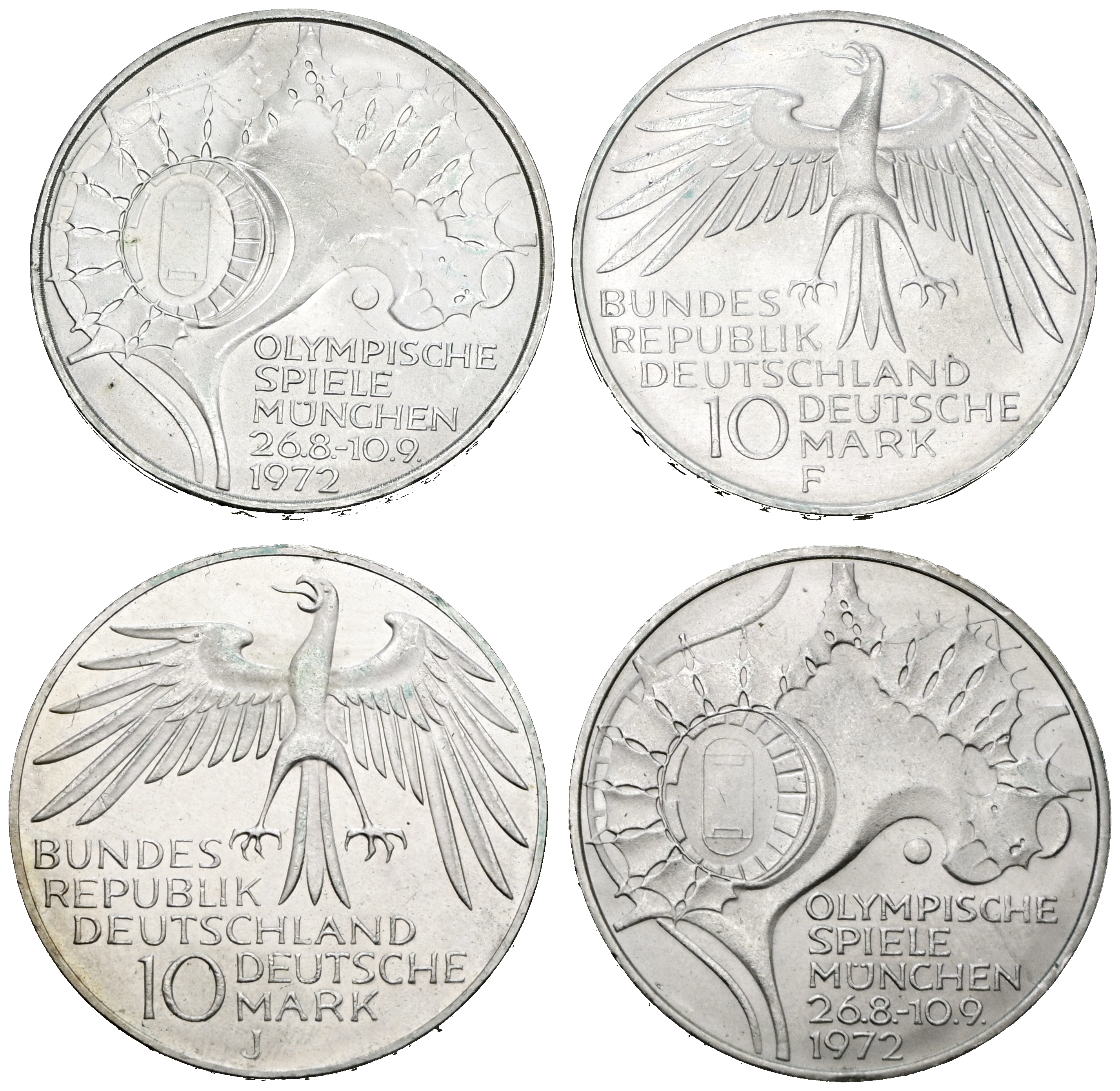 ALEMANIA. Conjunto de 10 Mark con las 4 cecas diferentes (D, F, G y J). 1972. Juegos Olímpicos de Munich. (Km#133). SC.