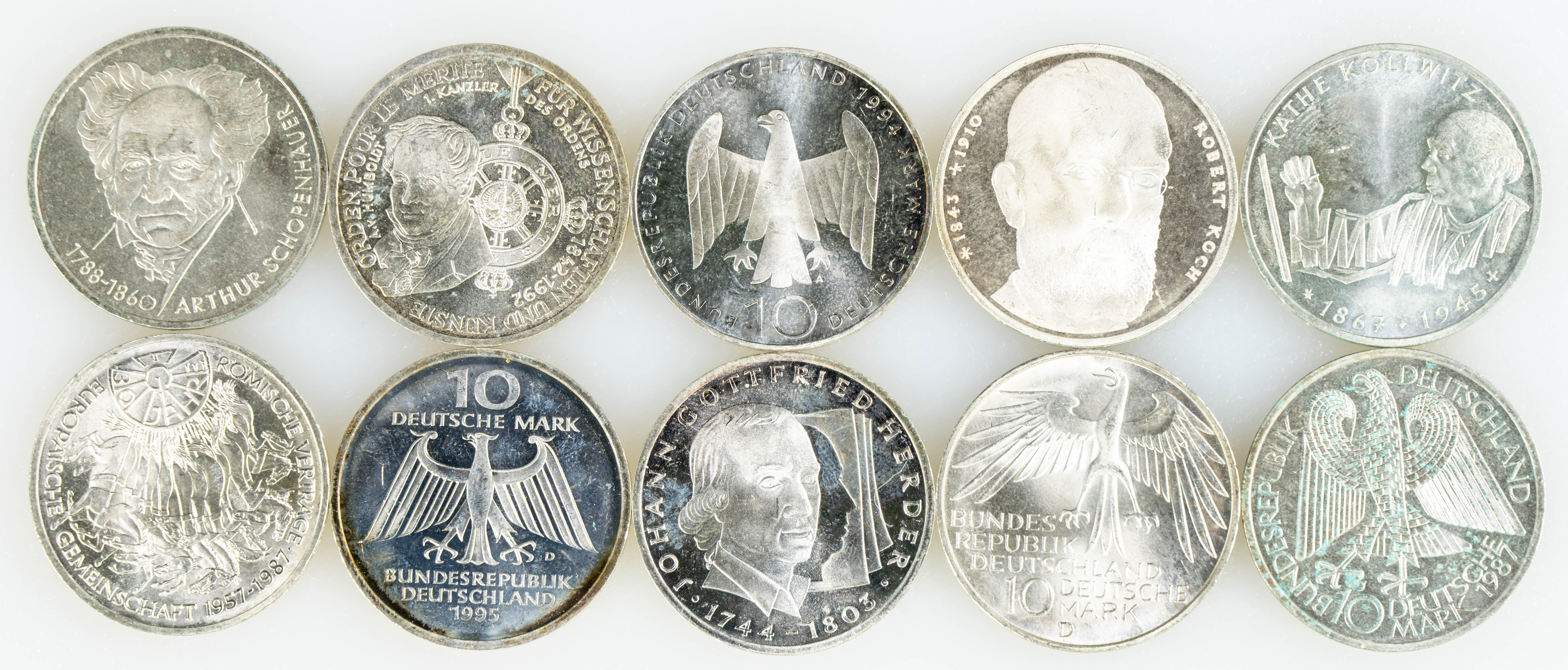 ALEMANIA. Bonito conjunto de 10 piezas de 10 Mark conmemorativas en plata con variedad de fechas (1972-1995) y cecas de acuñación. Ninguna moneda repetida. SC.
