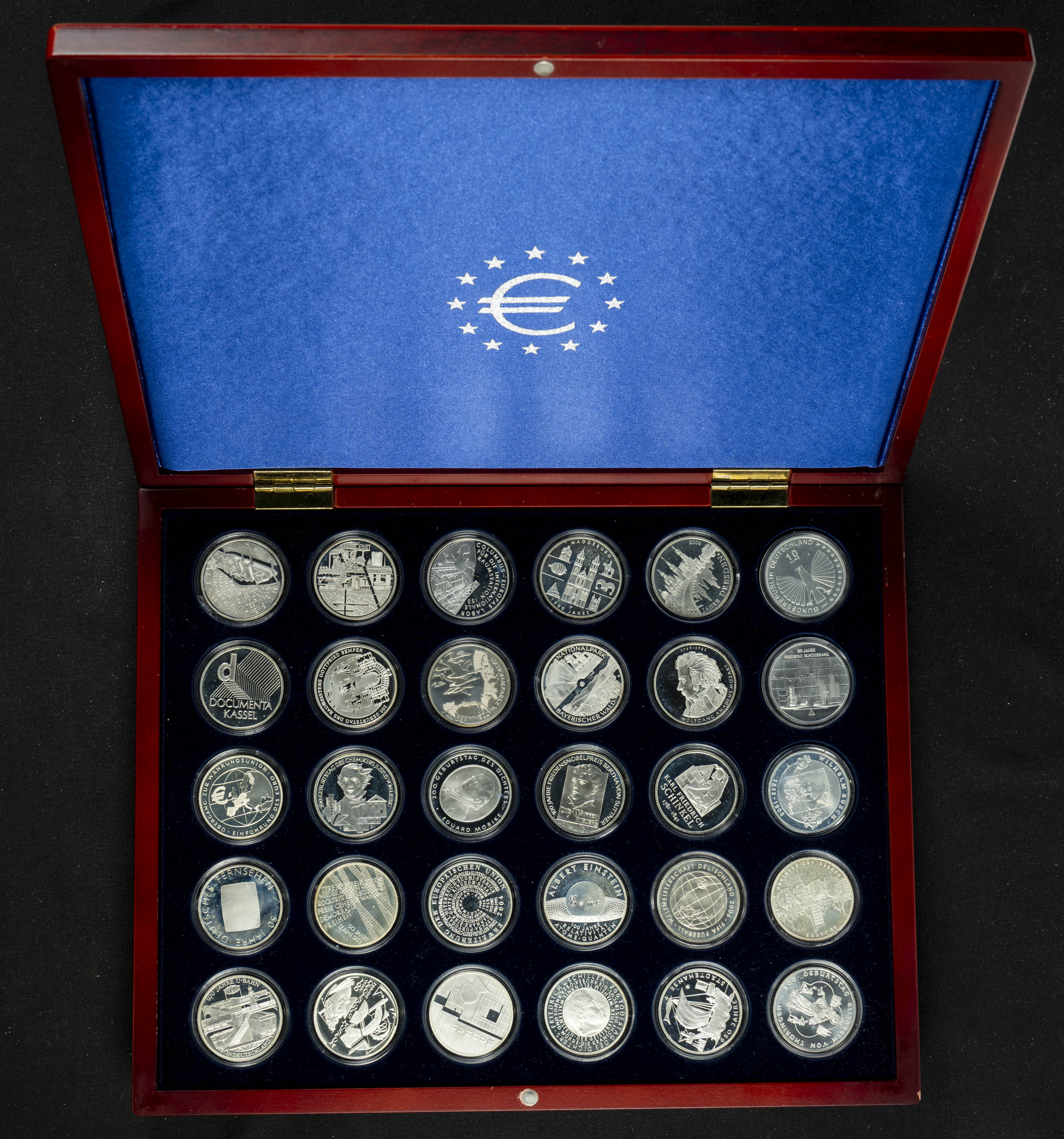 ALEMANIA. Estuche de madera compuesto por 30 monedas conmemorativas en plata de 10 Euros. 2002-2007. Todas diferentes. Calidades SC y PROOF. A EXAMINAR.