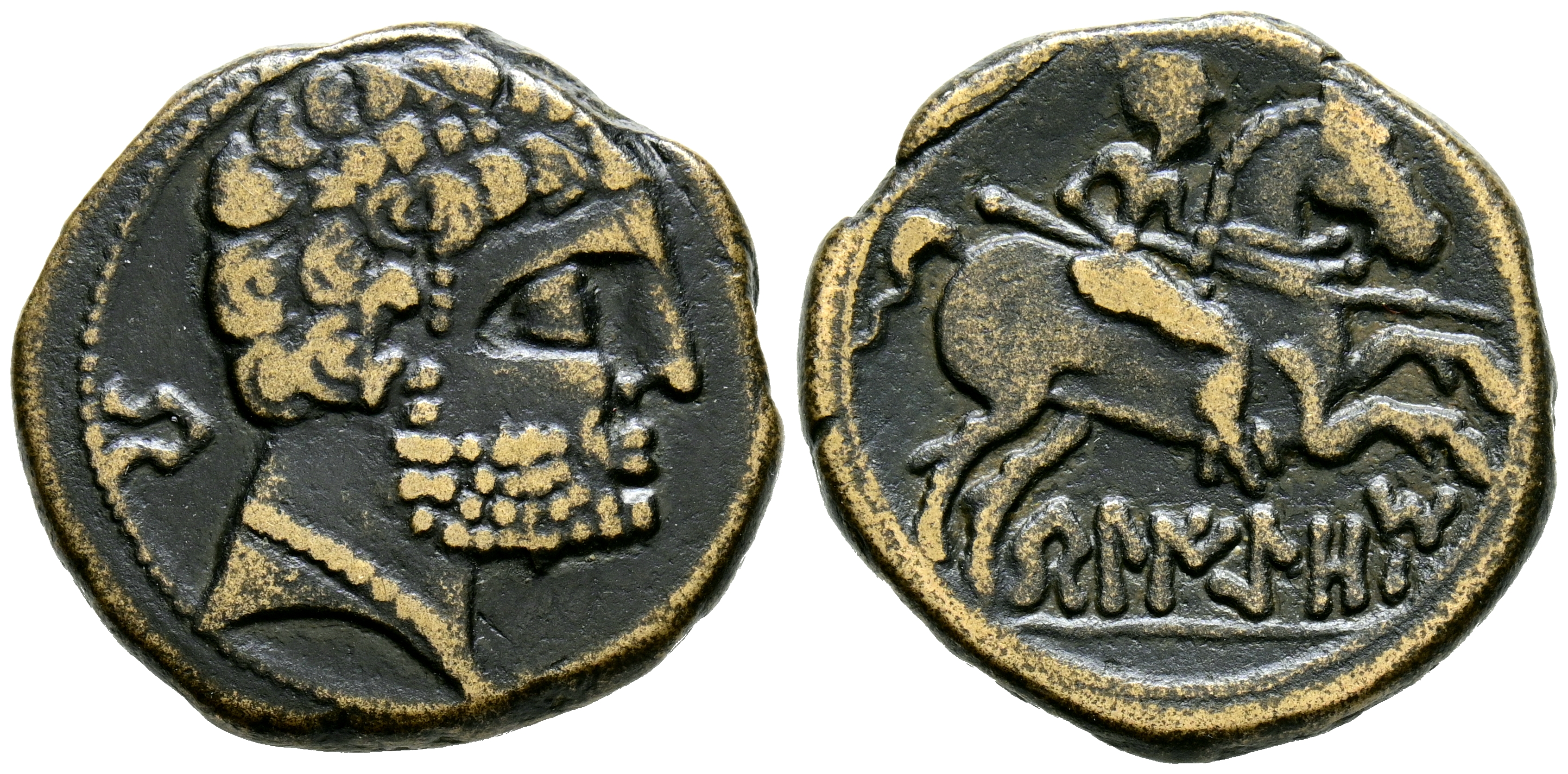 BELIGIOM (Belchite, Zaragoza). As. (Ae. 8,80g/24mm). 120-20 a.C. (FAB-243). Anv: Cabeza masculina barbada a derecha, detrás letra ibérica: Be. Rev: Jinete con lanza a derecha, debajo leyenda ibérica: BeLIGiOM. MBC.