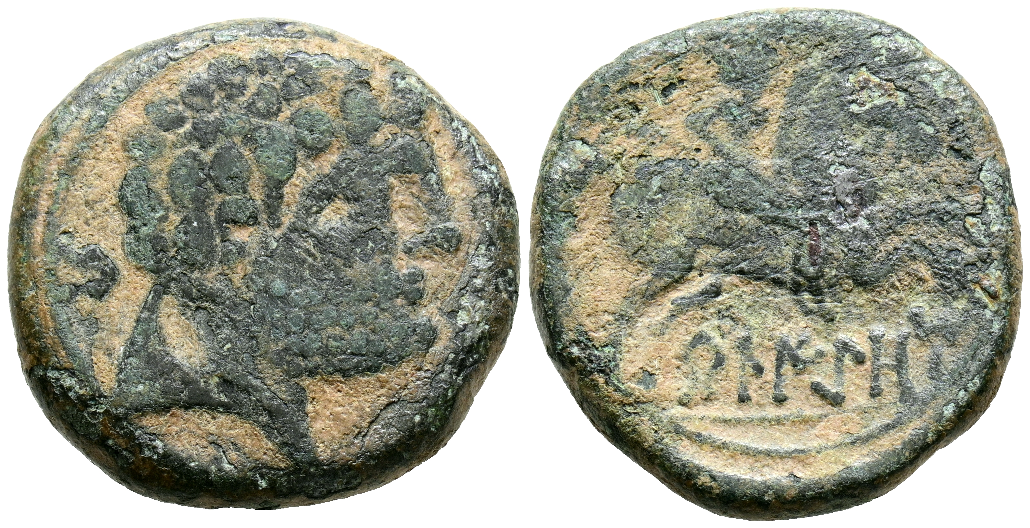 BELIGIOM (Belchite, Zaragoza). As. (Ae.11,23/24mm). 120-20 a.C. (FAB-243). Anv: Cabeza masculina barbada a derecha, detrás letra ibérica: Be. Rev: Jinete con lanza a derecha, debajo leyenda ibérica: BeLIGiOM. MBC-.