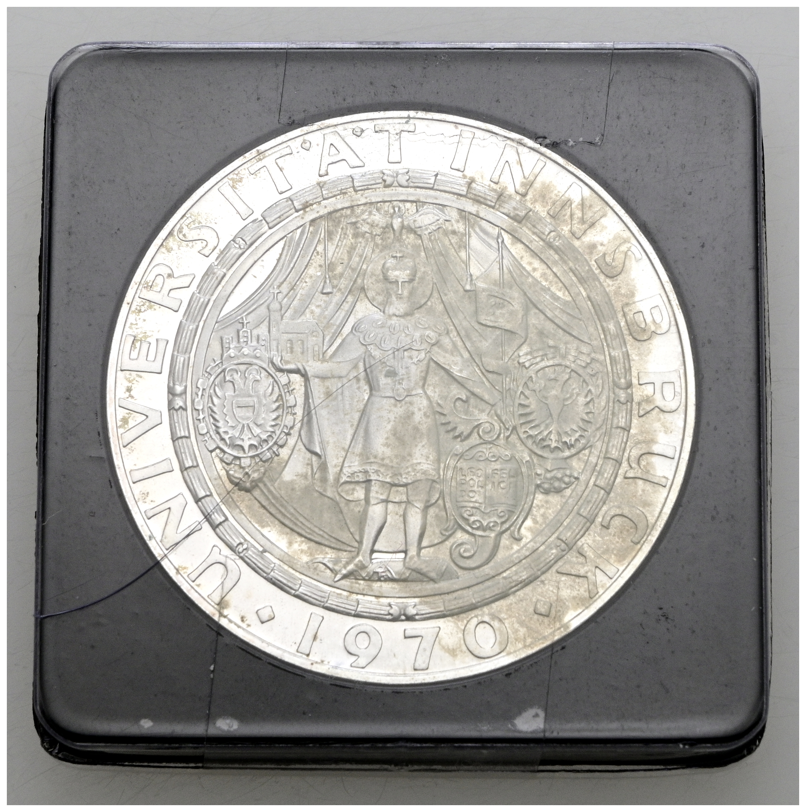 AUSTRIA. 50 Schilling. (Ar. 20,12g/34mm). 1970. 300 Aniversario de la Universidad de Innsbruck. (Km#2908). PROOF. Incluye pequeño estuche (algo deteriorado)